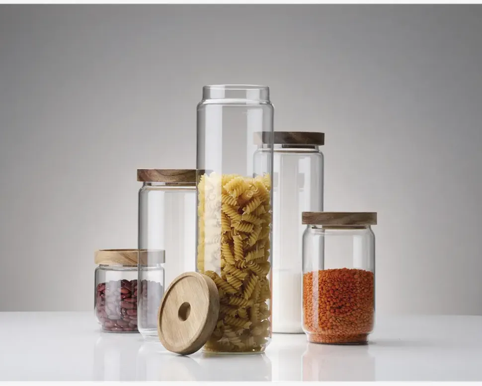 Elegant og funktionel madopbevaringsbøtte lavet i glas med et smukt trælåg. Perfekt til opbevaring af madvarer, da det tætsluttende låg hjælper med at bevare friskheden. Ideel til tørvarer. Bemærk at glas beholderen kan gå i opvaskeren mens at låget ikke gør.
