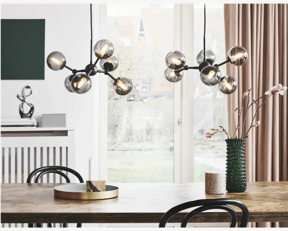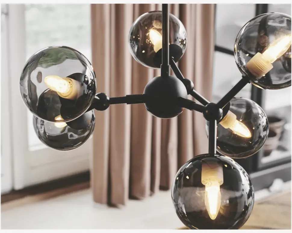 Atom pendlen fra Halo Design er en “form” for en lysekrone, hvor det rene design for lov at folde sig ud i fuld flor. Denne lampe har drejelige led på hver arm som gør det muligt dels at ændre designet på lampen samt dreje lyset hvorhen man ønsker der skal være lys. • Mål i cm: H.17,5 x Ø.4• Farve: Røgfarvet/sort• Materiale: Metal/Glas• Fatningstype: 6 x G9 maks 28W• Ekskl. Lyskilder