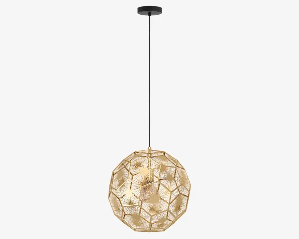 Skoura er en pendel fra Eglo der kommer med et unikt og elegant udtryk, der fanger opmærksomheden. Lampen vil med sit design være en central del af indretningen og kan placere flere steder i hjemmet for eksempel i stuen. Vælg evt. en dekorativ globepære, der vil skabe et fint udtryk. Lampen kommer i flere varianter.• Mål i cm: Ø.41• Farve: messing/sort • Materiale: stål• Fatning: E27, Max 60W• Ekskl. Lyskilde• IP20