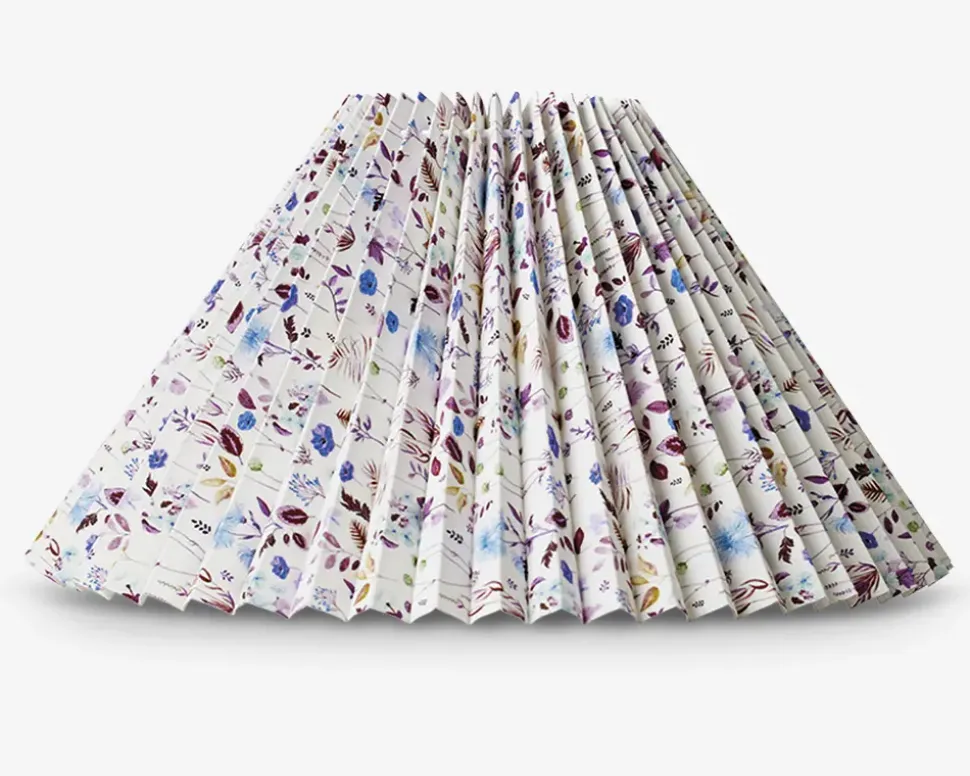 Plissélampeskærm af plastik, som vil skabe liv og hygge i hjemmet, da skærmen har et fint blomsterprint. Lampeskærmen sættes på ved at to metalbøjler inde i lampeskærmen klikkes ned over pæren.