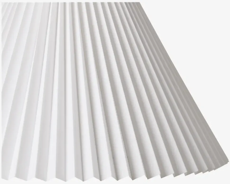 Flot og klassisk plisse lampeskærm af plastik , som passer ind i ethvert hjem, da farven er enkel og neutral. Lampeskærmen er særligt velegnet til en lampefod som kan købes fra sortiment. Lampeskærmen sættes på ved at to metalbøjler inde i lampeskærmen klikkes ned over pæren.