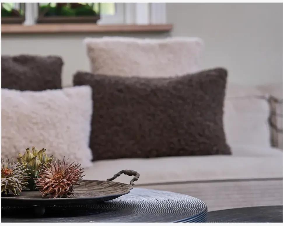 Pude i brun plys der måler 60 x 40 cm. En dekorativ og behagelig pude, som tilføjer varme og tekstur til din sofa, lænestol eller seng.