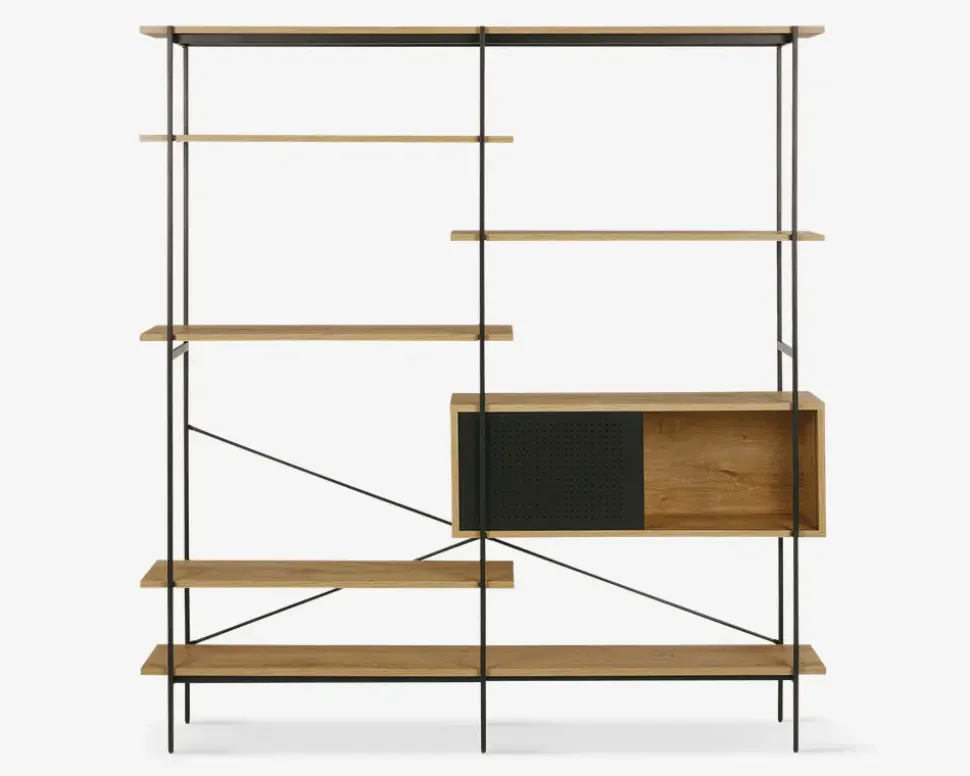 Flot reol med assymetrisk design. Hylder og skab er placeret assymmetrisk, som i sig selv er meget skulpturelt. Det giver reolen en simpel struktur og er en nyfortolkning af en retro opbevaringsløsning. Reolen har et skab med skydedør til opbevaring. Døren i skabet er i sortlakeret metal. Reolen er produceret med metalvanger som er sort lakeret og med vild eg kunstfiner på overfladerne. Dette gøre reolen meget rengøringsvenlig. Skal bare tørres af med en hårdt opvredet klud. Reolen kan selvfølgelig også stilles langs en væg og sammensættes med de andre reoler i denne serie.• Assymetrisk reol• Sort pulverlakeret metalstel• Hylder i vild eg kunstfiner• Dekorativt udseende• Leveres usamlet, men samles nemt• Mål i cm. B.172 x D.27 x H.188