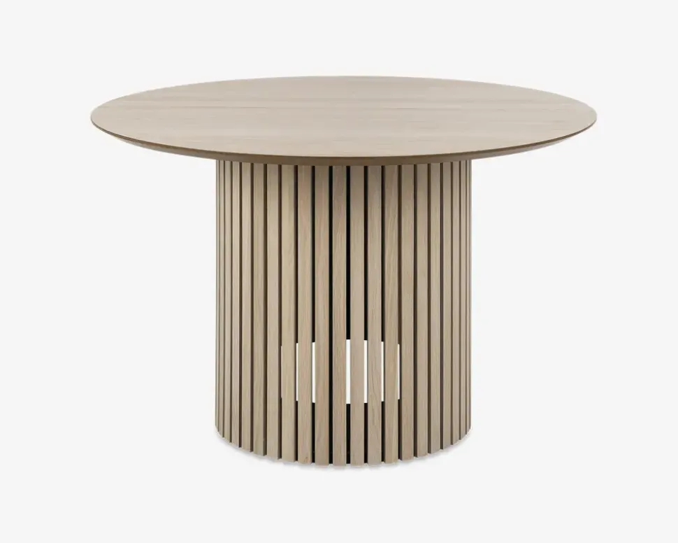 Rundt spisebord med bordplade i hvidolieret fineret eg, med stel i hvidolieret eg med lamel front. Designet passer perfekt sammen med skænk og vitrine i samme serie, og du vil opleve at din spisestue for et moderne udtryk. Spisebordet måler Ø. 120 cm, og ikke udvides med ekstra pladser, de 120 cm giver dig 4-6 spisepladser, og vil stå flot i hjemmet. Spisebordet bør behandles med hvidolie når du modtager det, for at sikre dig bedst mulig beskyttelse af overfladen, og derefter 1-2 gange om året, afhængig af om bordet udsættes for sollys eller andre varmekilder som kan udtørre bordet. Rengøringen foretages med en klud vredet op i rent vand.Bordet leveres usamlet, men samles uden problemer, hvis du følger den vedlagte samlevejledning. Vi anbefaler at I er 2 om at samle og flytte bordet. Vi anbefaler også at du benytter varmebrikker, samt dug eller dækkeservietter når du dækker bordet op.