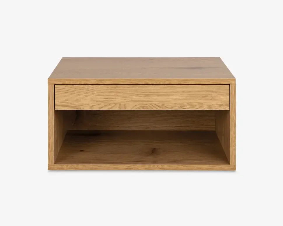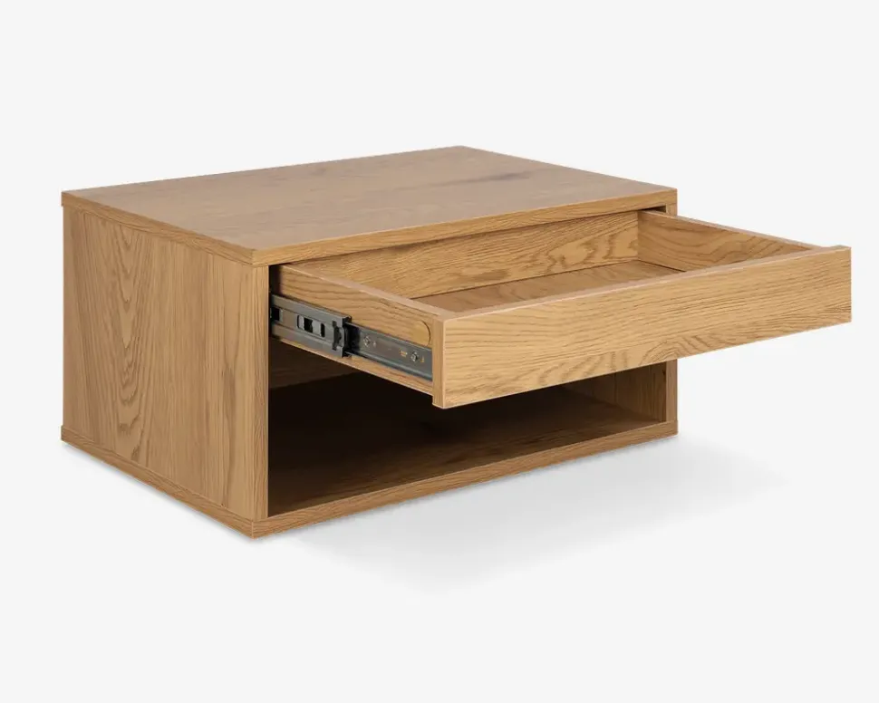Et væghængt senge bord som dette, er perfekt, det letter rengøringen, hvilket er praktisk i et soveværelse. Sengebordet har et moderne design, med rene linier, og passer derfor diskret ind i de fleste soveværelser. Skuffen og det åbne rum giver dig god mulighed for at opbevare alt, fra godnat læsningen, briller, medicin, du bestemmer helt selv.Sengebordet er fremstillet i vild kunstfiner, og kræver ingen vedligeholdelse, rengøringen foretages med en klud vredet op i rent vand. Bemærk at overfladen kan ridses, så hvis du vælger at placere en natlampe på bordet, anbefaler vi at du benytter filtdupper.Leveres usamlet