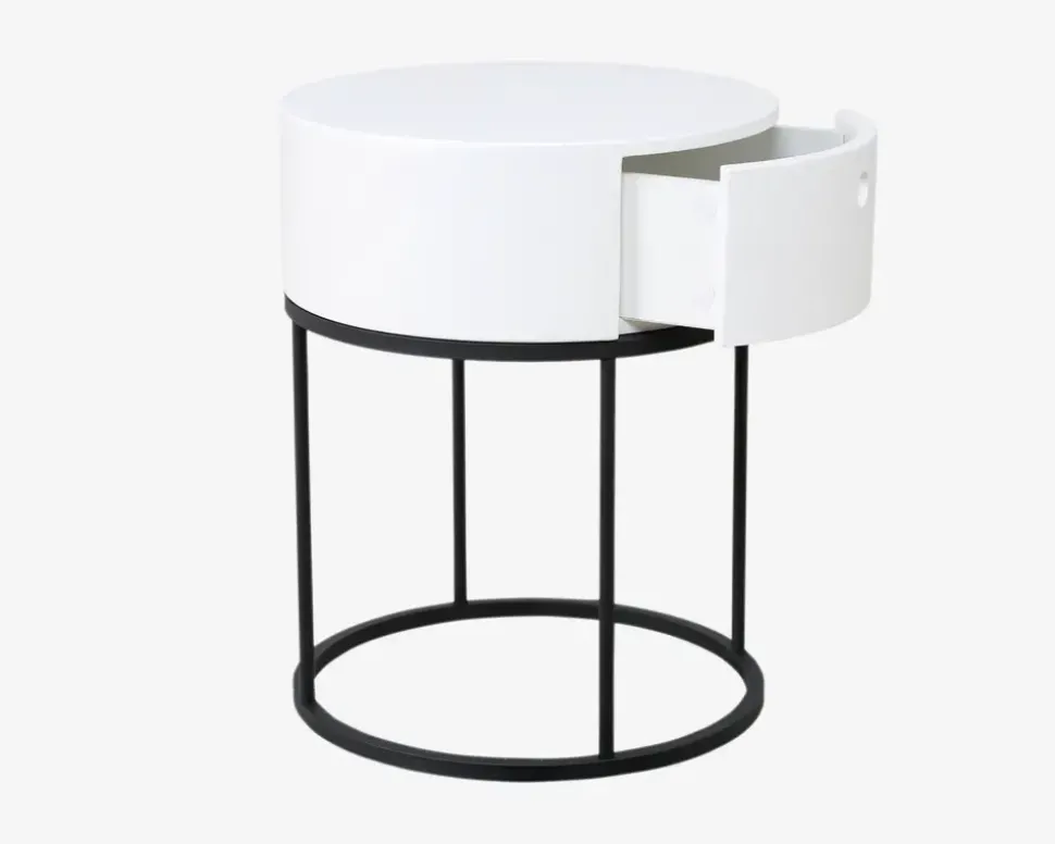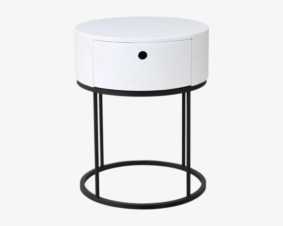 Smart lille sengebord i hvidlakeret MDF, med stel i sort pulverlakeret stål. Dette senge bord kan kombineres med en lang række af vores senge. Sengebordets højde på 51 cm gør den anvendelig il både sengelampe, briller og natlæsningen. Den lille skuffe gør bordet endnu mere brugbart, idet du her har mulighed for at opbevarer de ting du ikke ønsker ligger frit fremme.Sengebordet kræver ingen vedligeholdelse, skal blot aftørres med en klud vredet op i rent vand. Da der er tale om en lakeret overflade, skal du være opmærksom på at overfladen kan ridses, du kan derfor med fordel benytte filtdupper under eksempelvis bordlampen. Sengebordet leveres usamlet, men samles let.• Smart rundt sengebord• Hvid/sort• Inkl. 1 skuffe• Mål i cm.: H.51 x Ø.40• Leveres usamlet