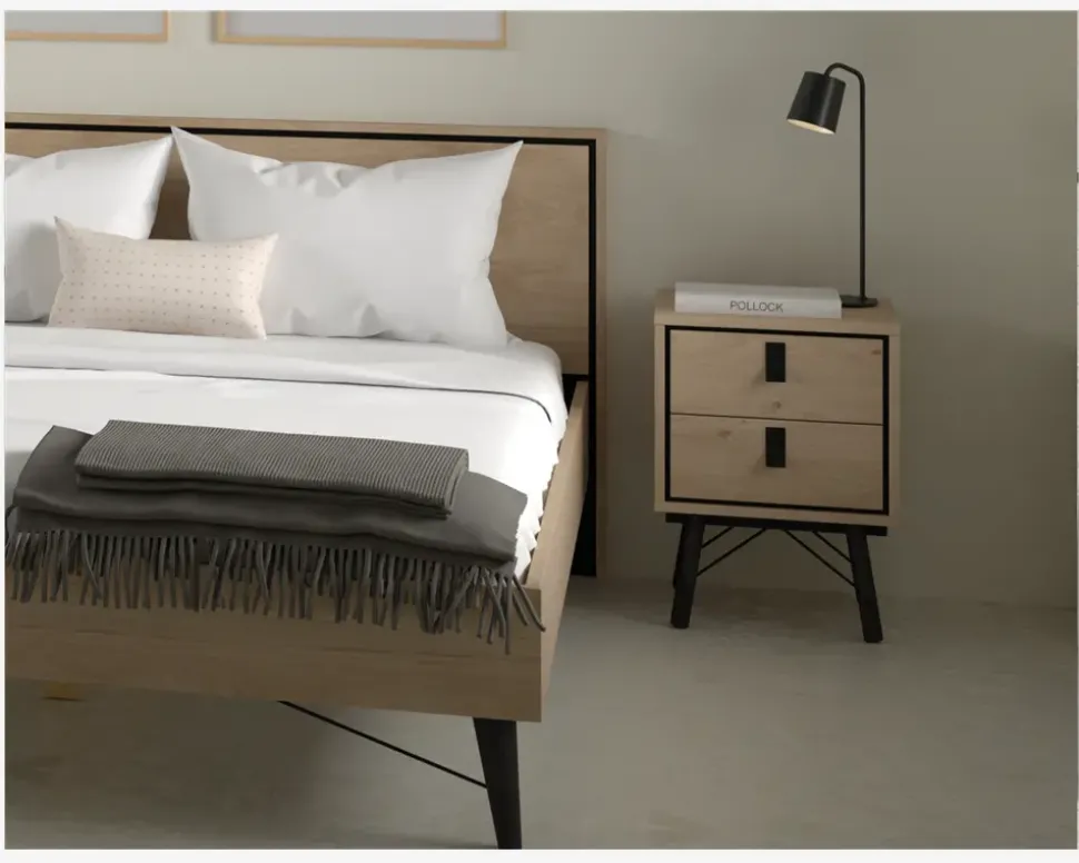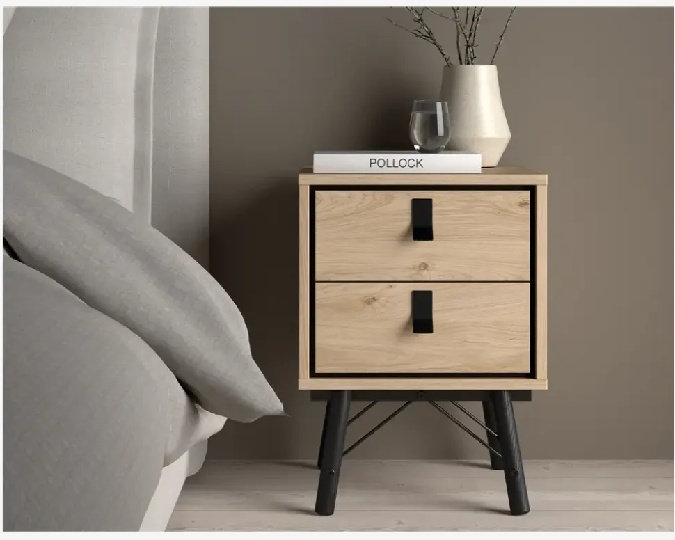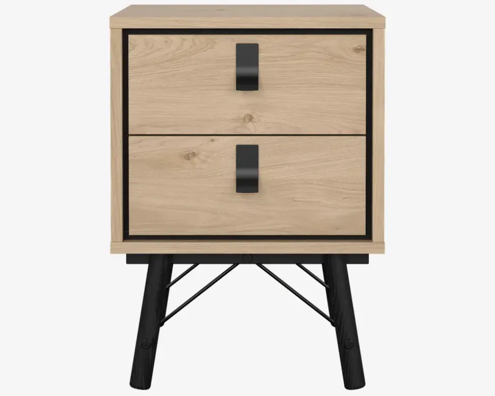 Ry er en serie af møbler som er fremstillet til spisestuen og soveværelset. Serien er fremstillet i et moderne design, som kan kombineres med en lang række af vores spiseborde og senge. Serien findes i 2 forskellige farvekombinationer sort/valnød eller i eg. De forskellige møbler er fremstillet i kunstfiner, som dels ikke kræver nogen vedligeholdelse, og samtidig er utrolig rengøringsvenlige. Alt du skal gøre er at vride en klud op i rent vand, og tørre møblet af. Skulle du opleve at du står overfor lidt mere genstridige mærker, kan disse fjernes med en smule husholdningssprit på en klud. Serien leveres usamlet, men hvis du blot holder dig til den medfølgende samlevejledning er møblet enkelt at samle. Du bør sætte lidt tid af, da der er mange løsdele. Dette sengebord i eg kunstfiner indeholder 2 skuffer. Sengebordet giver derfor en smule opbevaring til bøger, briller eller hvad du ellers har brug for at gemme af vejen, for at holde orden.• Eg kunstfiner• Rengøringsvenlig• Findes i andre udgaver• Mål i cm.: H.59,6 x B.43,3 x D.40,1• Leveres usamlet