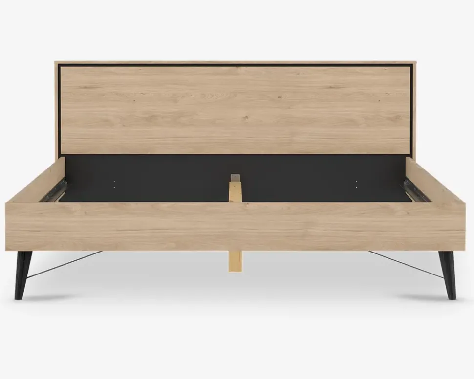 I den populære Ry serie til soveværelset, er der nu mulighed for at gennemfører indretningen så den passer sammen. Ry sengerammen er fremstillet i eg kunstfiner med sorte detaljer, og den passer perfekt sammen med kommoder, sengeborde og garderobeskab i samme serie. Sengerammen passer til et madras mål på B. 180 x L. 200 cm, og der kan både benyttes lamelbunde med springmadras, eller boxmadras. Sengerammen leveres usamlet, og vi anbefaler at I er 2 når sengerammen skal samles og flyttes. Sengerammen kræver ingen vedligeholdelse, og rengøringen foretages med en klud vredet op i rent vand.Hvis ikke du har bund og madras som du ønsker at genbruge, skal du huske at tilkøbe dette
