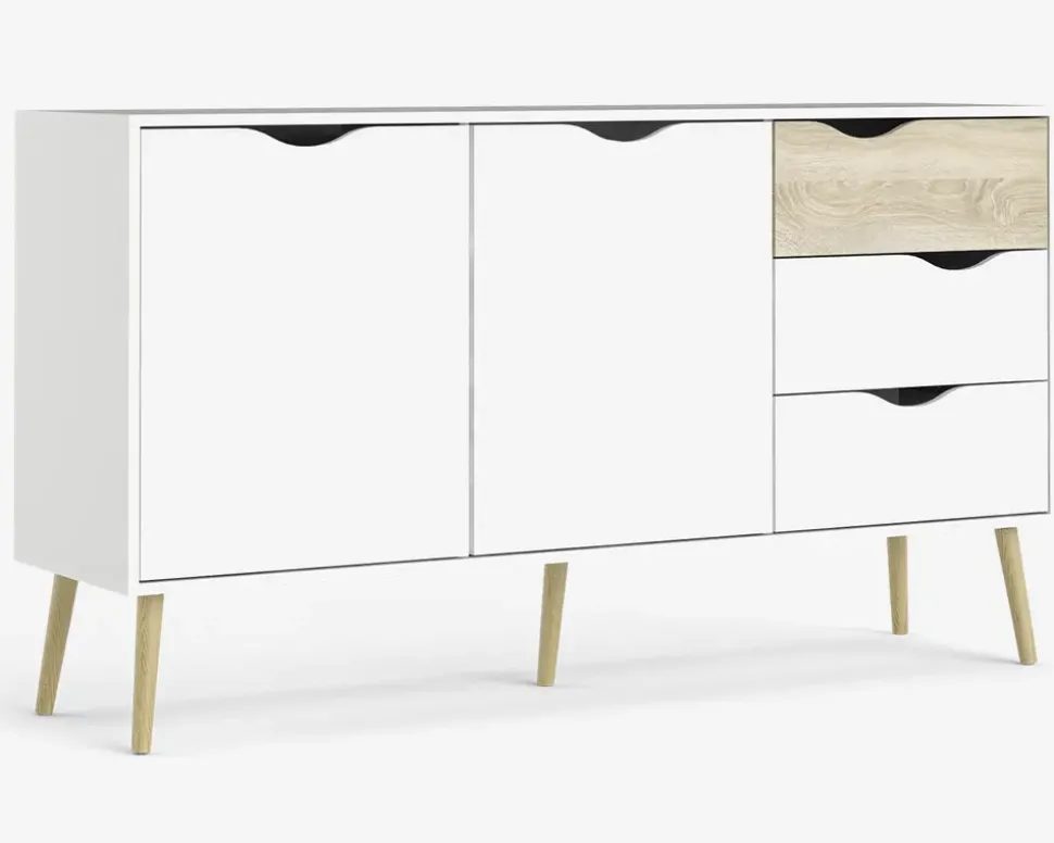 Denne smarte skænk i hvid/eg kunstfiner giver masser af plads til opbevaring i enten spisestuen eller køkkenet. Farve kombinationen passer perfekt sammen med en masse forskellige spiseborde og stole, og det lette skandinaviske design, vil passe flot ind i mange hjem. Materialerne sikre dig et møbel, som er nemt at rengøre og vedligeholde, kunstfiner tåler alle former for rengøringsmidler, undtaget rengøringsmidler med slibemidler i.Skænken har 2 døre, bag dem er der en løs hylde, samt 3 skuffer. Skænken er nem at samle, og du vil opleve en kvalitet som du kan have glæde af i mange år fremover.• Let og elegant design• Rengøringsvenlige materialer• Mål i cm.: H.82 x B.147 x D.40• Leveres usamlet, men samles nemt