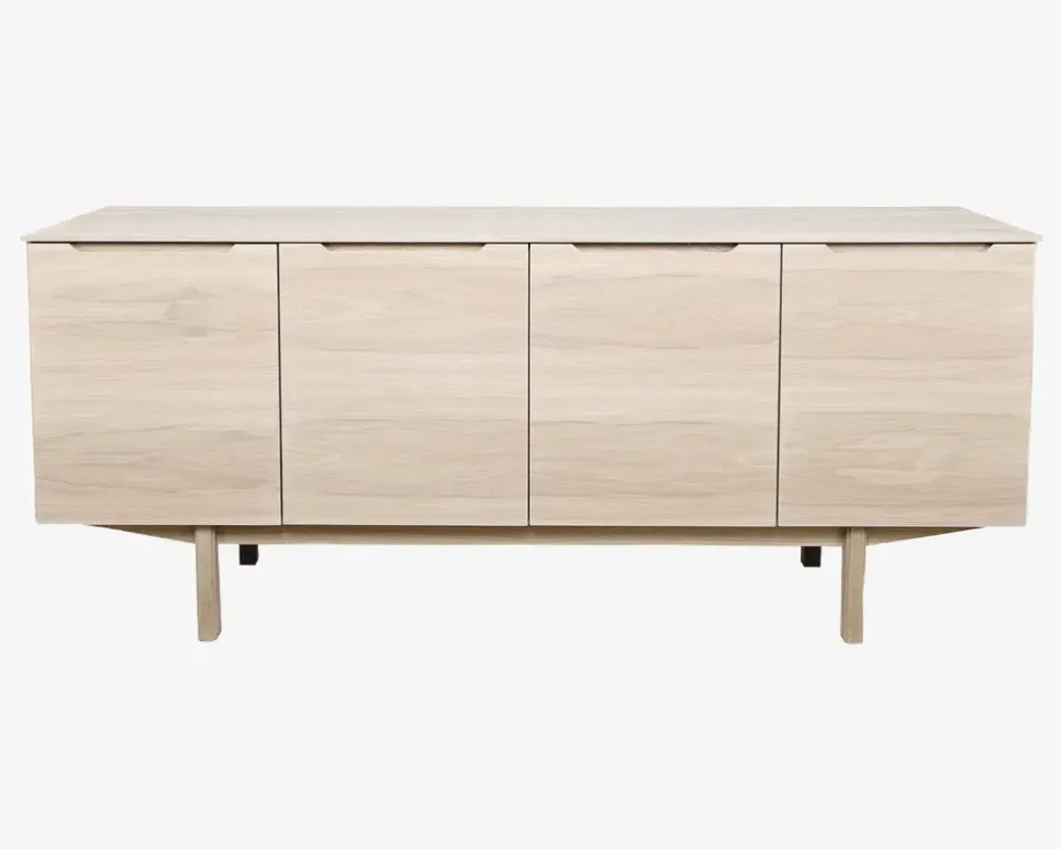 En skænk i meget høj kvalitet, produceret hos den danske møbelproducent Skovby Møbelfabrik. Skovby Møbelfabrik er kendt for at fremstille møbler i både klassiske og moderne design i meget høj kvalitet, til rimelige priser.Denne skænk er fremstillet i fineret olieret eg, skænken bør vedligeholdes med hvidolie med jævne mellemrum, hvor tit det skal ske er umuligt og sige, da det afhænger af hvor møblet er placeret i hjemmet. Hvis skænken er placeret direkte i sollys, eller på et meget varmt sted, vil du opleve at den skal behandles oftere, ind hvis den står længere inde i stuen, og ikke får direkte sollys. Hvis der skulle opstå en lille skade på møblet, kan du slibe med fint sandpapir, og derefter genbehandle møblet med hvidolie, så vil skænken stå som ny igen. Bemærk at naturtræ ændrer farve (tager patina) når det udsættes for lys, hvilket betyder at du kan være nødt til at slibe hele skænken ned, for at få samme farve på møblet, efter behandlingen.Skænken er inddelt i 3 rum, bag hver af de 2 døre til højre findes en indvendig skuffe med selvluk, samt en hylde, de 2 døre til venstre dækker over et stort rum med en hylde. Det giver dig mulighed for at opbevare selv store fade i skænken. Alle 4 døre er udstyret med softclose, som både giver en eksklusiv følelse, og samtidig er med til at skåne døren når den lukkes.• Fineret hvidoliere eg• 2 indvendige skuffer med selvluk• 2 smalle hylder• 1 bred hylde i dobbelt skabet• Softclose på alle 4 døre• Mål i cm.: H.79 x B.194 x D.41• Vægt: 70 kg• Leveres samlet, dog skal hylder og ben monteres