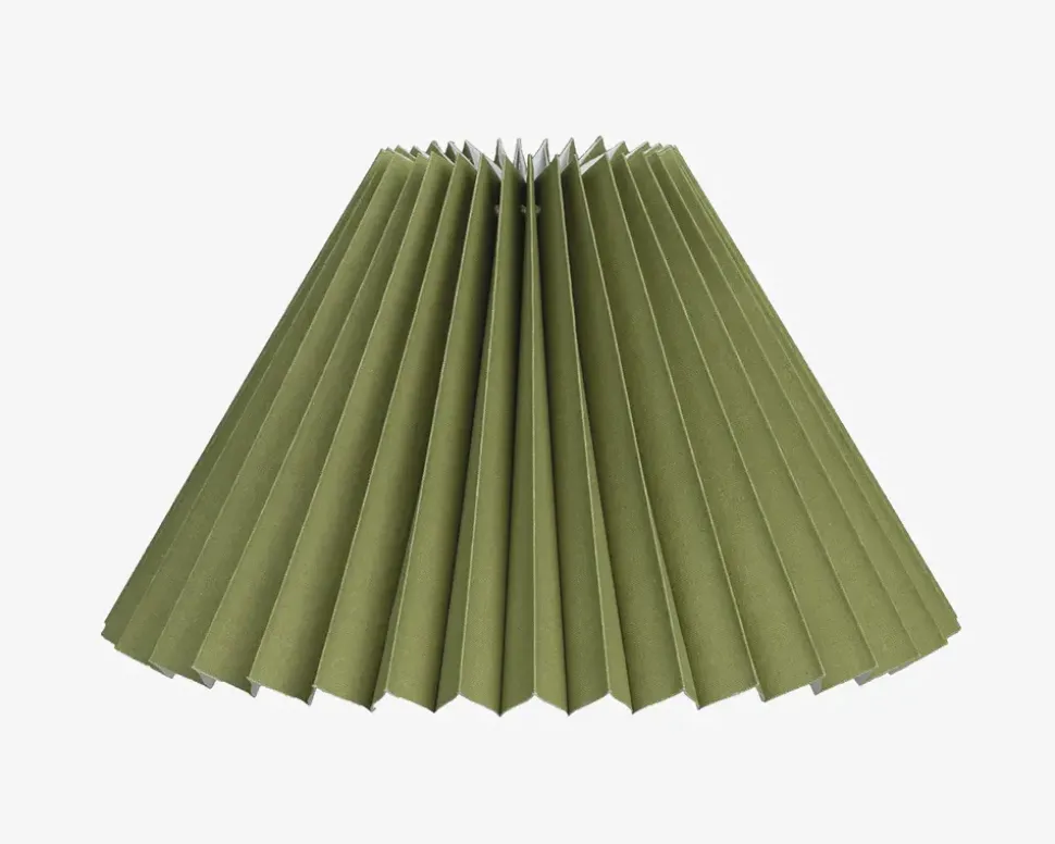 Flot og klassisk lampeskærm af stof/plastik , som passer ind i ethvert hjem, da den grønne farve bidrager til liv og personlighed i hjemmet. Lampeskærmen er særligt velegnet til en lampefod som kan købes fra sortiment. Lampeskærmen sættes på ved at to metalbøjler inde i lampeskærmen klikkes ned over pæren.