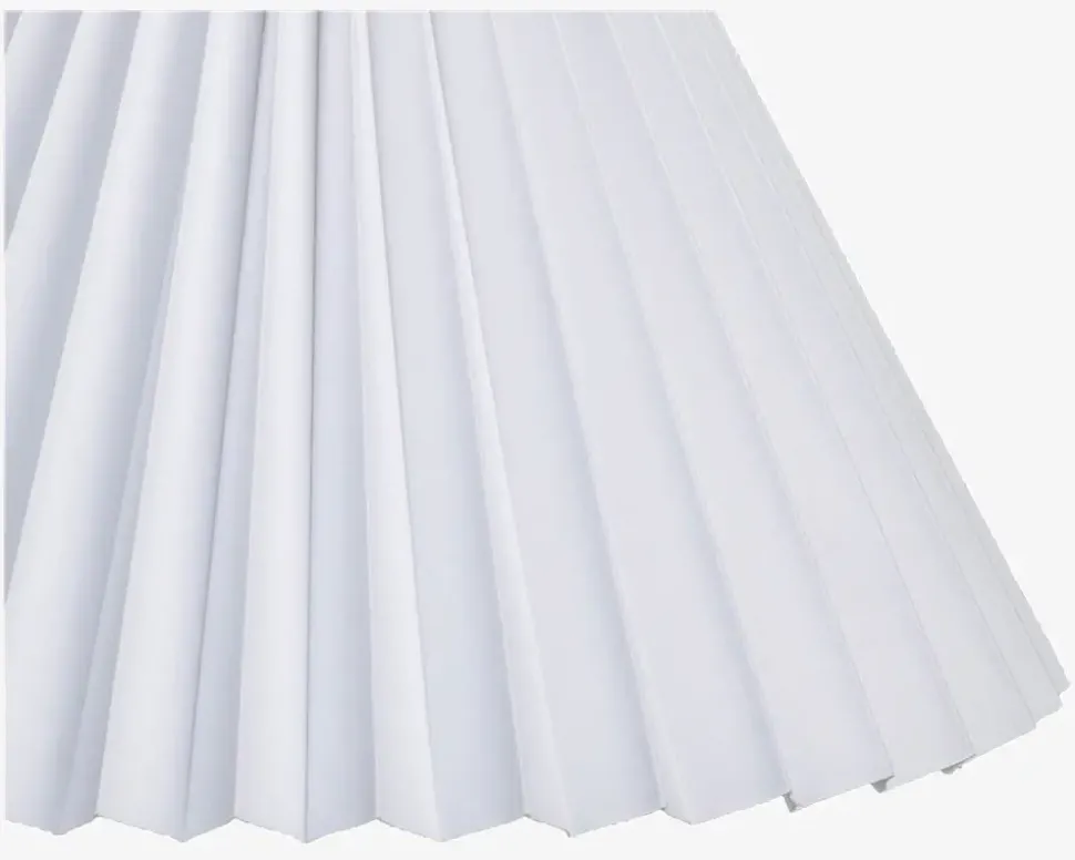 Flot og klassisk lampeskærm af stof/plastik , som passer ind i ethvert hjem, da den hvide farve er neutral. Lampeskærmen er særligt velegnet til en lampefod som kan købes fra sortiment. Lampeskærmen sættes på ved at to metalbøjler inde i lampeskærmen klikkes ned over pæren.