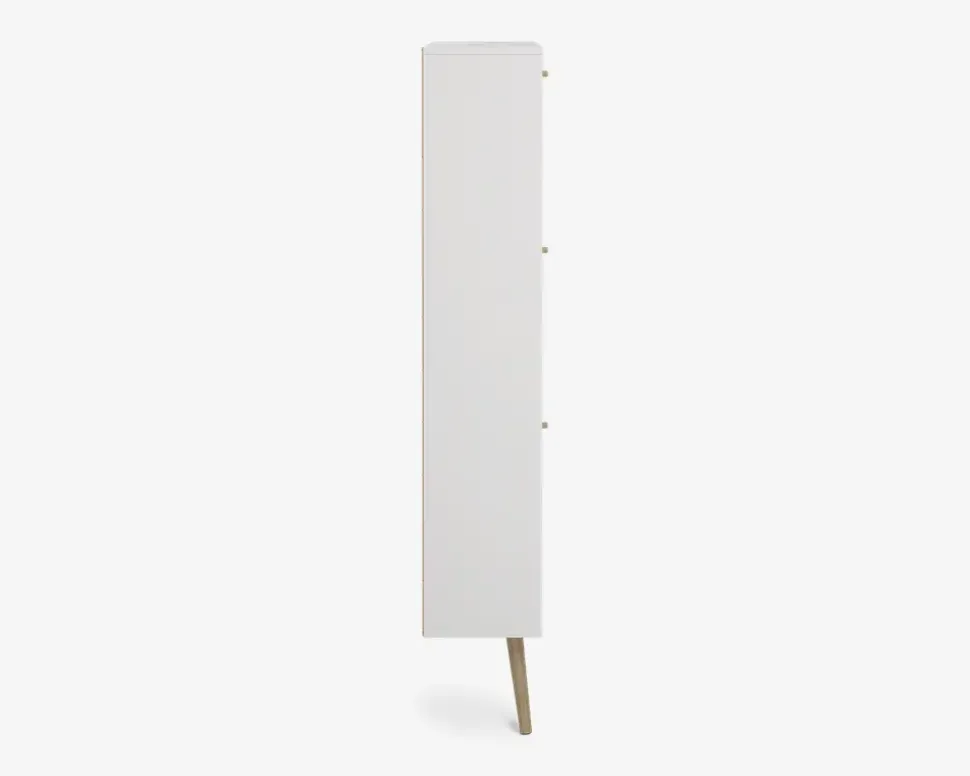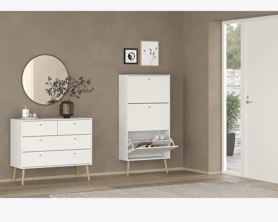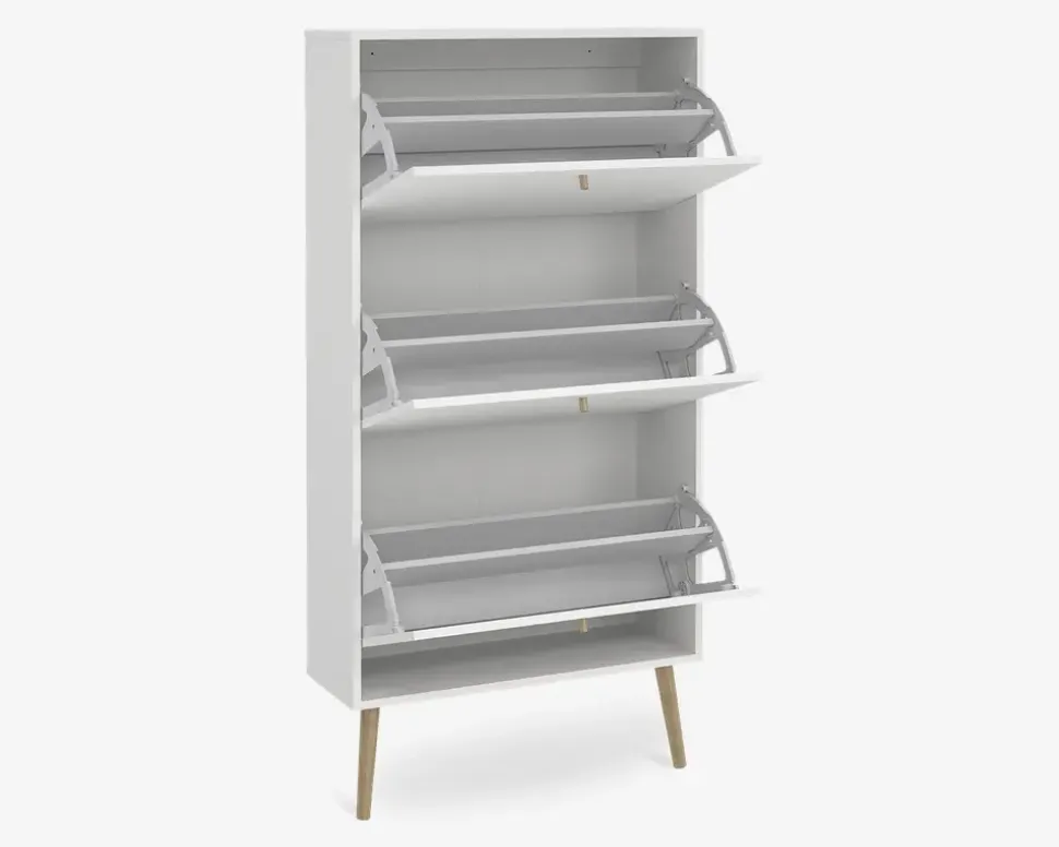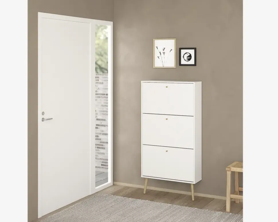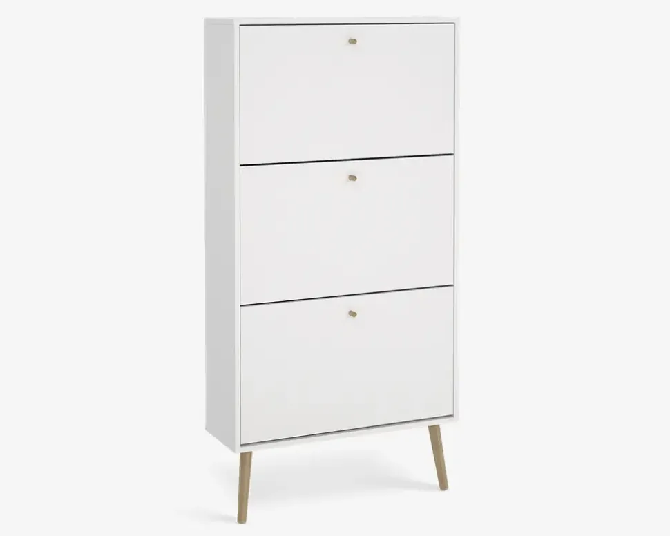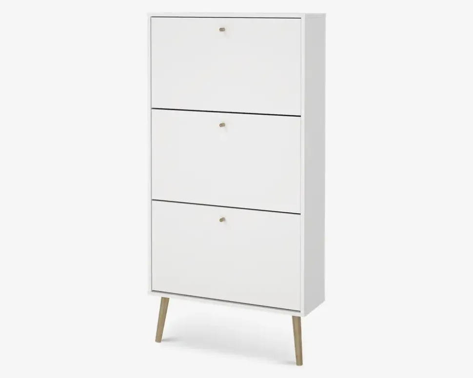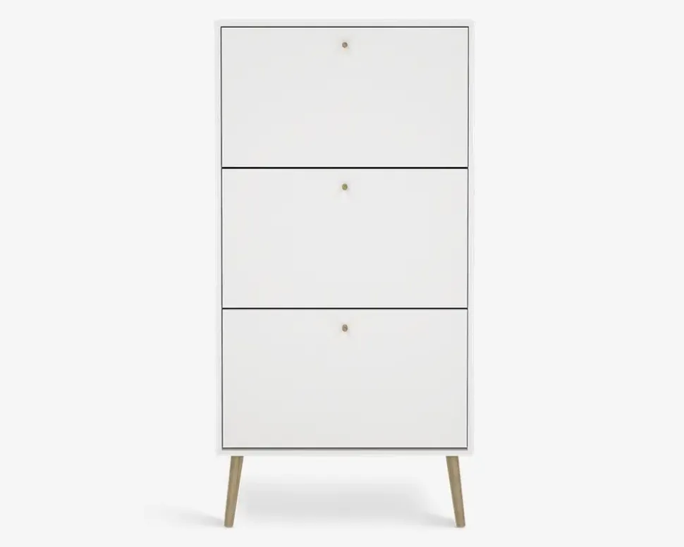 Bodo er en serie som består af en række opbevaringsmøbler, til soveværelset eller spisestuen, men de kan også benyttes i både entreen og bryggers, kort sagt en serie af møbler som hjælper med opbevaringen af ting.Dette skoskab giver plads til op til 18 par sko, i de 3 dobbeltskuffer. Hver skuffe kan bærer op til 5 kg. så du må lige veje sikkerhedsskoene. Hvid du bruger størrelse 44 eller mere, er dette nok ikke det rigtige skoskab til dig.Skoskabet leveres usamlet, men samles uden de store problemer, hvis du følger den vedlagte samlevejledning, du skal sætte et par timer af til at samle skabet, og vi anbefaler at I er 2 når det skal flyttes på plads. Bemærk skoskabet skal fastmonteres til væggen.Skoskabet er fremstillet i hvid kunstfiner med ben i massiv eg. Det kræver ingen vedligeholdelse, og remgøres med en klud vredet op i rent vand..