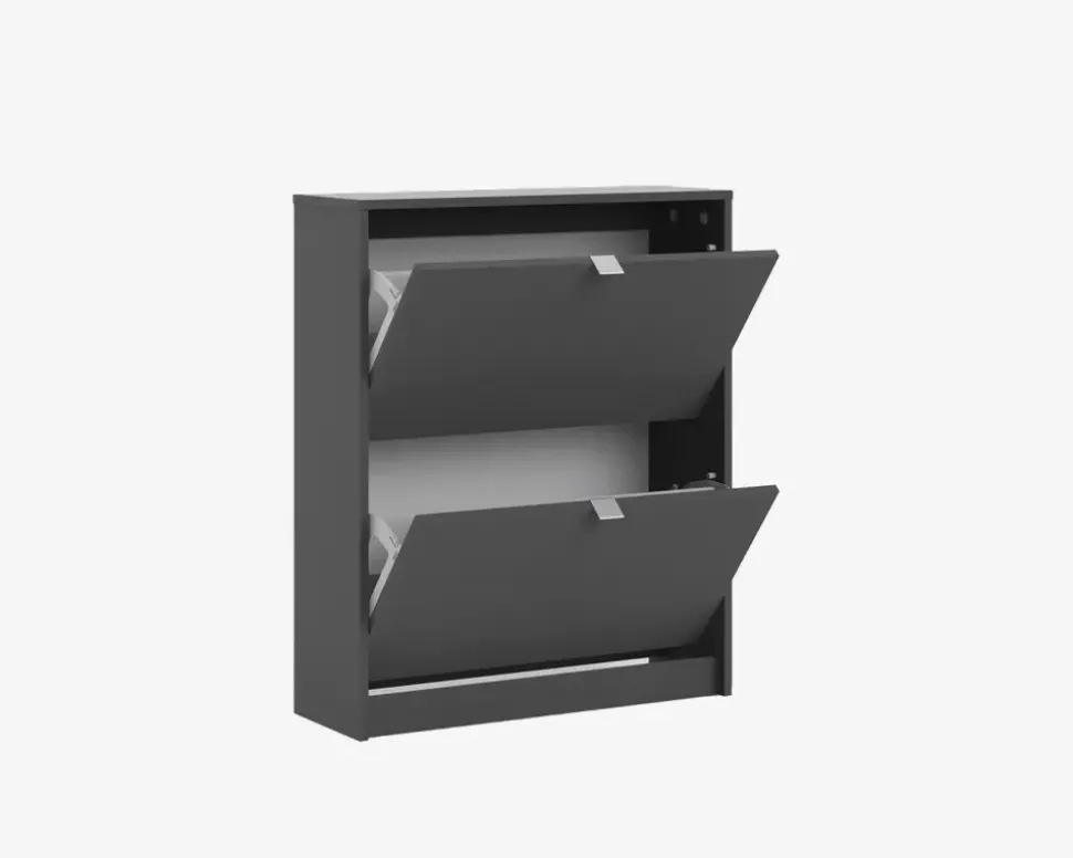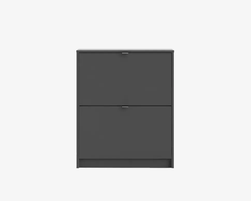 Et flot skoskab med 2 låger, som i alt giver plads til 12 par sko i varierende størrelser. Hver låge har 2 rækker, så hvis du mangler opbevaringsplads til dine sko, har du her muligheden. Skoskabet er en del af en serie bestående af skoskabe i forskellige størrelser, og de findes i flere forskellige farver, dette giver dig god mulighed for at finde en der passer hjem hos dig, uanset om det er størrelsen eller farven du ønsker at passe ind.Skoskabet er fremstillet i gråt kunstfiner, som nemt rengøres, med en klud vredet op i rent vand. Der skal ikke bruges rengøringsmidler, er du uheldig og få et sål mærke på skabet, kan denne fjernes med en lille smule husholdningssprit på en klud. Sten og jord vil ridse skuffen indvendigt. Vi anbefaler grundet den lille dybde på skabet at det fastgøres til væggen, på den måde sikre du at skabet ikke vælter når du åbner den øverste låge. Skabet leveres usamlet, hvis du følger den vedlagte samlevejledning samles det nemt, men det tager lidt tid.• Findes i 3 farver• Findes i 3 højder• Mål i cm.: H.85,2 x B.70,3 x D.24,05• Leveres usamlet