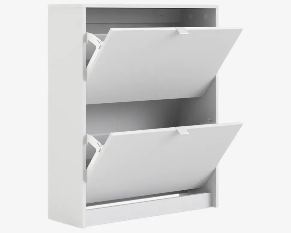 Et flot skoskab med 2 låger, som i alt giver plads til 12 par sko i varierende størrelser. Hver låge har 2 rækker, så hvis du mangler opbevaringsplads til dine sko, har du her muligheden. Skoskabet er en del af en serie bestående af skoskabe i forskellige størrelser, og de findes i flere forskellige farver, dette giver dig god mulighed for at finde en der passer hjem hos dig, uanset om det er størrelsen eller farven du ønsker at passe ind.Skoskabet er fremstillet i hvid kunstfiner, som nemt rengøres, med en klud vredet op i rent vand. Der skal ikke bruges rengøringsmidler, er du uheldig og få et sål mærke på skabet, kan denne fjernes med en lille smule husholdningssprit på en klud. Sten og jord vil ridse skuffen indvendigt. Vi anbefaler grundet den lille dybde på skabet at det fastgøres til væggen, på den måde sikre du at skabet ikke vælter når du åbner den øverste låge. Skabet leveres usamlet, hvis du følger den vedlagte samlevejledning samles det nemt, men det tager lidt tid.• Findes i 3 farver• Findes i 3 højder• Mål i cm.: H.85,2 x B.70,3 x D.24,05• Leveres usamlet