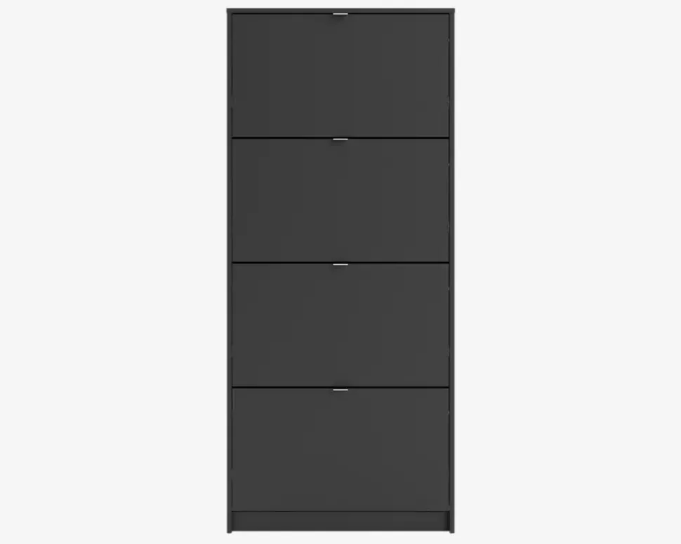 Et flot skoskab med 4 låger, som i alt giver plads til 24 par sko i varierende størrelser. Hver låge har 2 rækker, så hvis du mangler opbevaringsplads til dine sko, har du her muligheden. Skoskabet er en del af en serie bestående af skoskabe i forskellige størrelser, og de findes i flere forskellige farver, dette giver dig god mulighed for at finde en der passer hjem hos dig, uanset om det er størrelsen eller farven du ønsker at passe ind.Skoskabet er fremstillet i mat sort kunstfiner, som nemt rengøres, med en klud vredet op i rent vand. Der skal ikke bruges rengøringsmidler, er du uheldig og få et sål mærke på skabet, kan denne fjernes med en lille smule husholdningssprit på en klud. Sten og jord vil ridse skuffen indvendigt. Vi anbefaler grundet den lille dybde på skabet at det fastgøres til væggen, på den måde sikre du at skabet ikke vælter når du åbner den øverste låge. Skabet leveres usamlet, hvis du følger den vedlagte samlevejledning samles det nemt, men det tager lidt tid.• Findes i 3 farver• Findes i 3 højder• Mål i cm.: H.162 x B.70,3 x D.24,05• Leveres usamlet