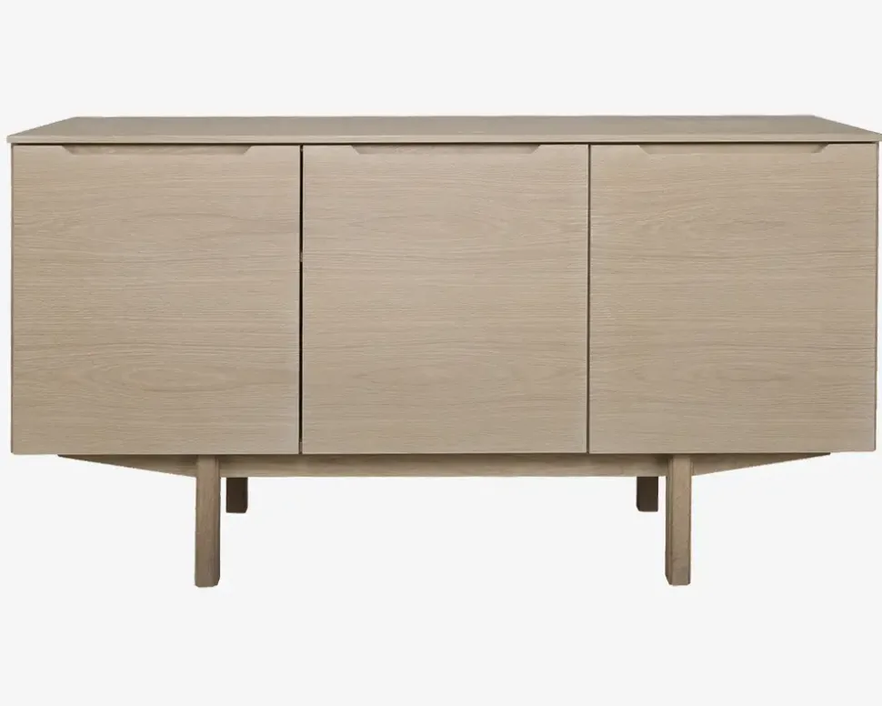 Den kompakte skænk er velegnet til både spisestuen , dagligstuen eller køkken alrummet, hvor pladsen er mindre men behovet for opbevaring stadig er stort. Det lette og klassiske design gør at skænken passer ind i et hver moderne bolig. Skænken har 3 låger, den ene gemmer på en hylde og en skuffe, mens de andre to låger afslører et stor rum med en hylde, som giver overaskende meget opbevaringsplads. Denne skænk er fremstillet i fineret hvid olieret eg, skænken bør vedligeholdes med hvid olie med jævne mellemrum, hvor tit det skal ske er umuligt og sige, da det afhænger af hvor møblet er placeret i hjemmet. Hvis skænken er placeret direkte i sollys, eller på et meget varmt sted, vil du opleve at den skal behandles oftere, end hvis den står længere inde i stuen, og ikke får direkte sollys. Hvis der skulle opstå en lille skade på møblet, kan du slibe med fint sandpapir, og derefter behandle møblet med hvid olie igen, så vil skænken stå som ny igen. Bemærk at naturtræ ændrer farve (tager patina) når det udsættes for lys, hvilket betyder at du kan være nødt til at slibe hele skænken ned, for at få samme farve på møblet, efter behandlingen.En skænk i meget høj kvalitet, produceret hos den danske møbelproducent Skovby Møbelfabrik. Skovby Møbelfabrik er kendt for at fremstille møbler i både klassiske og moderne design i meget høj kvalitet, til rimelige priser.