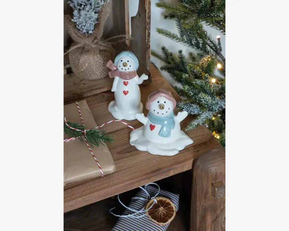 Dekorativ snemand i hvid med en højde på 10,5 cm og en bredde på 5,2 cm. Figuren har et charmerende udtryk, der bringer julestemning ind i hjemmet. Perfekt til at placere på en hylde, i vindueskarmen eller som del af en hyggelig juleopstilling.