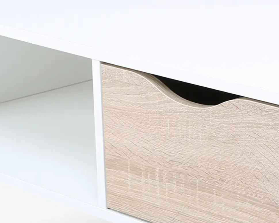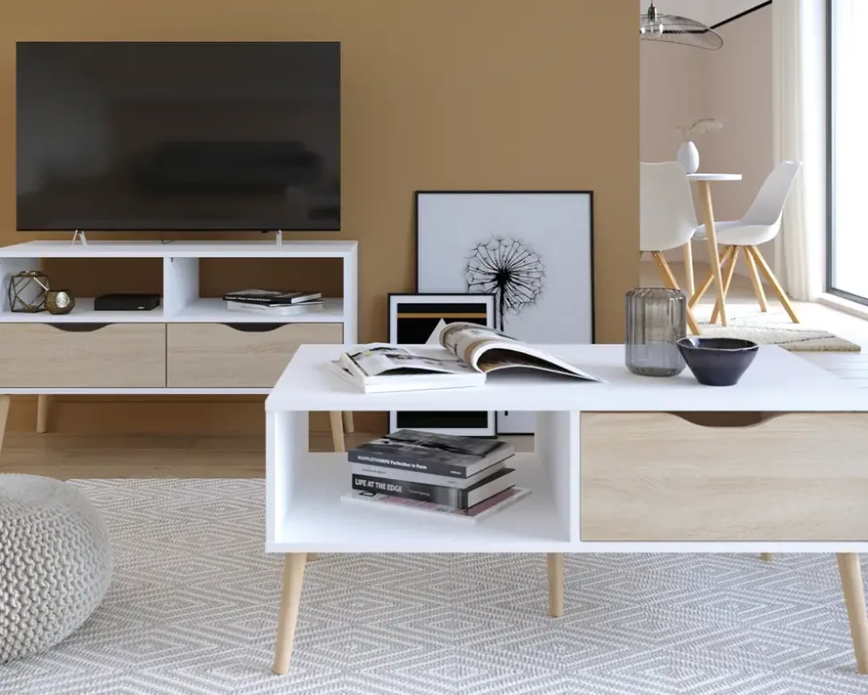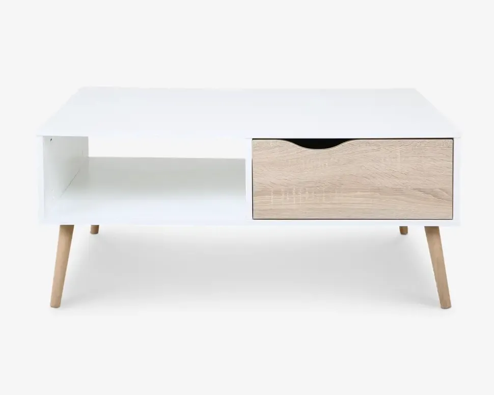 Elegant og flot retro inspireret sofabord med en stor gennemgående skuffe. Sofabordet er fremstillet i hvid med en lys eg kunstfiner på fronten. Med massive træben. Leveres usamlet, men samles let.Sofabordet er en del af en stor serie af møbler, som har et moderne og smart udtryk, serien er fremstillet i rengøringsvenlige materialer, og kan både som enkelt møbel og som serie stå som et frisk pust til indretningen. Se hele det store udvalg af Delta møbler her eller i en af vores møbelhuse.• Let og elegant design• 1 stor gennemgående skuffe• Rengøringsvenlige materialer• Massive træben• Leveres usamlet, men samles let• Mål i cm: L.99 x B.60 x H.44