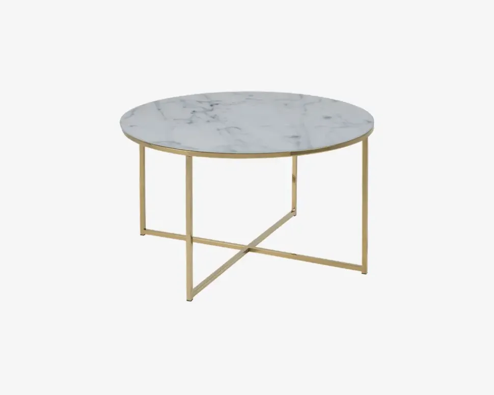 Elegant og moderne sofabord med glasplade som har marmortryk, så det ligner en marmoroverflade. Det har den fordel at bordet ikke er så tungt som et bord med marmorplade men er ligeså modstandsdygtig overfor ridser, varme ting osv. Bordet har et metalstel med messing farve som lige nu er noget af det mest ”hotte”. Det findes i et par forskellige udgaver. Her vist som sofabord i rundt, i 80 cm i diameter. Bordet leveres usamlet, men samles nemt.• Elegant og moderne sofabord• Glasplade med marmorprint• Messing farvet metalstel• Leveres usamlet, men samles nemt• Mål i cm. Dia. 80 cm. H. 45 cm