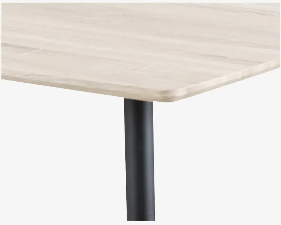 Lille spisebord er perfekt til den lille lejlighed eller til køkkenet. Med sit lette design og rengøringsvenlige materialer, er det både praktisk og smart til denne lille spiseplads. Hvis du vælger en mindre stol, får du uden problemer 4 gode spisepladser. Der findes ikke tillægsplade til bordet,Spisebordet er fremstillet i vedligeholdelsesfrie materialer. Bordplader er beklædt med egefavet kunstfiner, som både er meget ridsefast, og samtidig tåler en del varme. Skulle junior eller du selv være uheldig med en tusch eller lignende, kan du fjerne det med en smule husholdningssprit på en ren klud, bordet må ikke afvaskes i husholdningssprit. Vi anbefaler at du benytter dækkeservietter og varmebrikker, når du dækker bordet. Benene er i sort pulverlakeret stål, som giver en hård overflade, dog bør dog stadig være forsigtig når du støvsuger og lignende, så du undgår at ridse benene.• Nemt at rengøre• Tåler en del varme• Mål i cm: H.75 x B.70 x L.120• Leveres usamlet