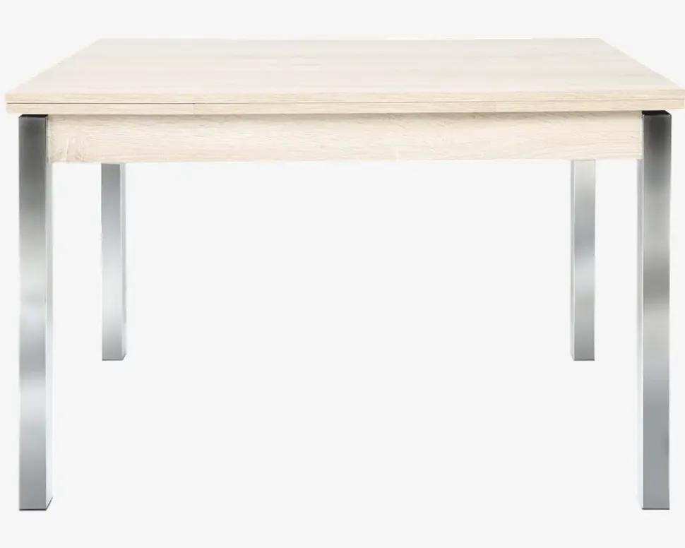 Smart lille spisebord i eg kunstfiner med krom ben som passer perfekt ind i den moderne indretning. Spisebordet har hollandsk udtræk, som betyder at du kan trække en tillægsplade ud i begge ender af bordet, og derved få endnu mere spiseplads. Spisebordet måler B.80 x L.120 cm når det ikke er trukket ud, og det er en god størrelse, både hvis du skal bruge bordet i køkkenet, eller i den lille lejlighed. Der er god plads til 4 personer. Spisebordet udvides nemt med en udtræksplade i begge ender, og du får en længde på 187 cm, og det skulle give god plads til 6-8 personer. Bordpladens overflade er i ege melamin, den er ikke modtagelig overfor fedtede fingre, og du vil opleve et spisebord som er nemt og rengøre og som står flot i hjemmet.Kunstfiner overfladen udmærker sig ved at være særdeles nem at rengøre, overfladen tåler alle former for rengøringsmidler, så længe de ikke indeholder slibemidler. Overfladen kan tåle meget varme, men vi anbefaler at du benytter skåne eller varmebrikker hvis du placerer en gryde på bordet. Overfladen kan ridses, så for at undgå skader kan du med fordel benytte dækservietter, under dit service. Bordet findes også i målet B.80 x L.80 cm, samt i sort eller hvid kunstfiner.• Moderne design• Nemt at samle• God størrelse til den lille lejlighed• Mål i cm.: H.76 x B.80 x L.120• Udslået mål i cm.: H.76 x B.80 x L.187 • Leveres usamlet