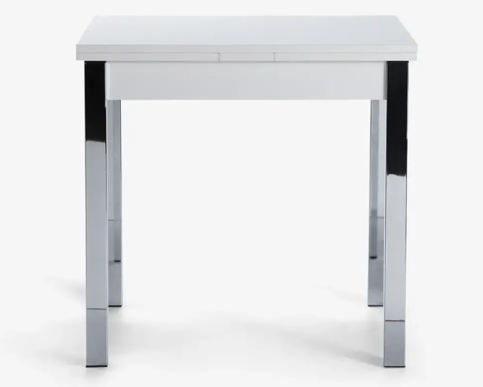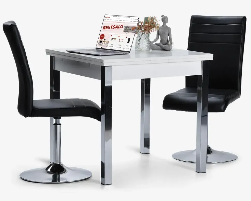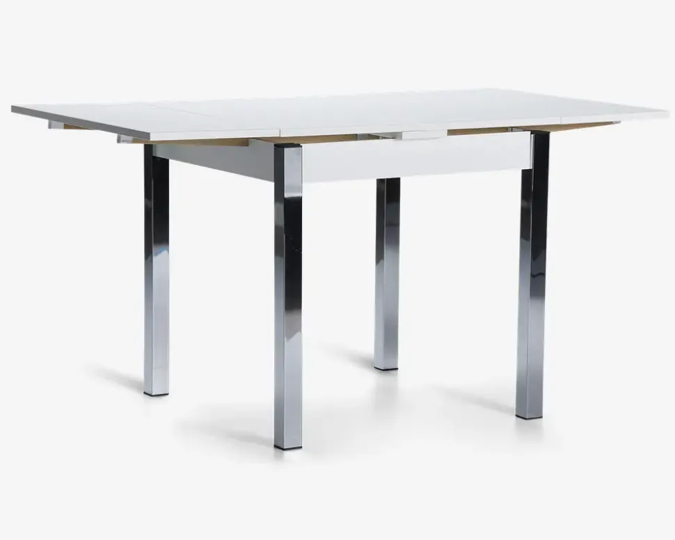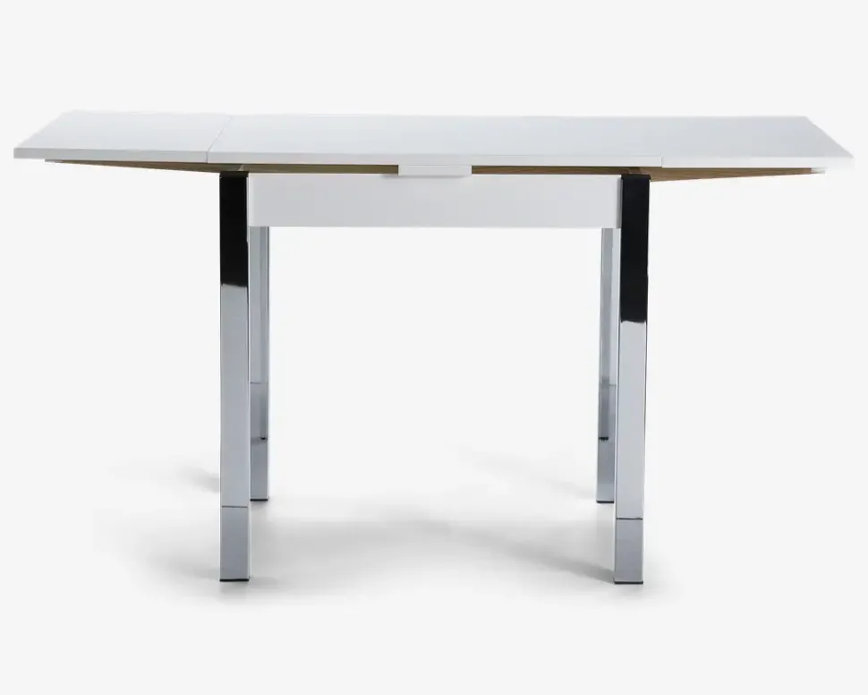 Smart lille spisebord i hvid/krom som passer perfekt ind i den moderne indretning. Spisebordet har hollandsk udtræk, som betyder at du kan trække en tillægsplade ud i begge ender af bordet, og derved få endnu mere spiseplads. Spisebordet måler B.80 x L.80 cm når det ikke er trukket ud, og det er en god størrelse, både hvis du skal bruge bordet i køkkenet, eller i den lille lejlighed. Der er god plads til 2 personer. Spisebordet udvides nemt med en udtræksplade i begge ender, og du får en længde på 147 cm, og det skulle give god plads til 4-6 personer. Bordpladens overflade er i hvid kunstfiner, den er ikke modtagelig overfor fedtede fingre, og du vil opleve et spisebord som er nemt og rengøre og som står flot i hjemmet.Kunstfiner overfladen udmærker sig ved at være særdeles nem at rengøre, overfladen tåler alle former for rengøringsmidler, så længe de ikke indeholder slibemidler. Overfladen kan tåle meget varme, men vi anbefaler at du benytter skåne eller varmebrikker hvis du placerer en gryde på bordet. Overfladen kan ridses, så for at undgå skader kan du med fordel benytte dækservietter, under dit service. Bordet findes også i målet B.80 x L.120 cm, samt i eg kunstfiner eller sort.• Moderne design• Nemt at samle• Mål i cm.: H.76 x B.80 x L.80• Udslået mål i cm.: H.76 x B.80 x L.147• Leveres usamlet