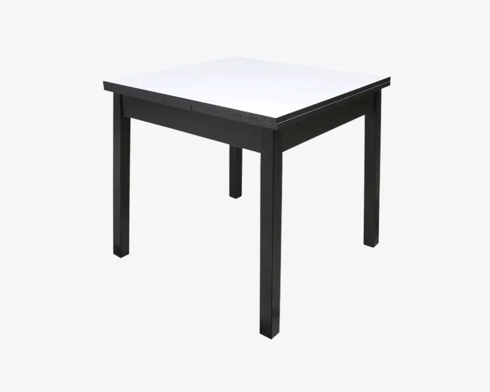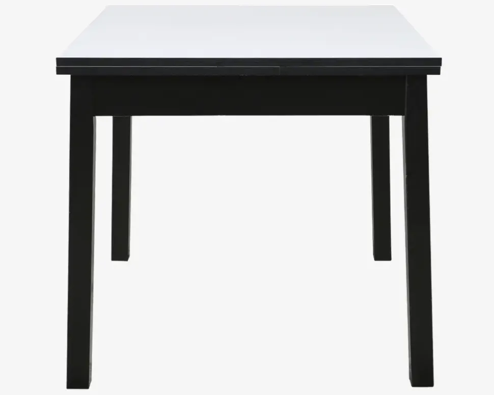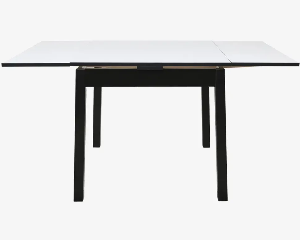 Dutch er et smart lille spisebord med hollandsk udtræk. Bordet udmærker sig ved ikke at fylde meget, og dog har du stadig muligheden for at få 6 gode spisepladser. Når bordet ikke er slået ud, måler det B.80 x L.80 cm, og er perfekt til 2 spisende personer.Bordet er velegnet til køkkenet eller den lille lejlighed, hvor I til hverdag kun har brug for 2 spisepladser, når der kommer gæster kan bordet med et snuptag udvides med en plade i begge sider, og så får du et bord der måler B.80 x L.146 cm, og dermed god plads til vennerne.Bordet er fremstillet med en bordplade i hvid kunstfiner, mens kanter og ben er sorte. Bordet er nemt at rengøre. Den daglige rengøring foretages med en klud vredet op i rent vand, men skulle uheldet være ude kan kraftigere rengøringsmidler sagtens bruges, de må dog ikke indeholde slibemidler. Benene monteres nemt.• Hvid bordplade med sorte ben• Mål i cm: H.74 x B.80 x D.80• Udslået mål med 2 plader: H.76 x B.80 x L.146• Findes også i 80×120 cm• Kan også fås i eg/hvid, • Leveres usamlet