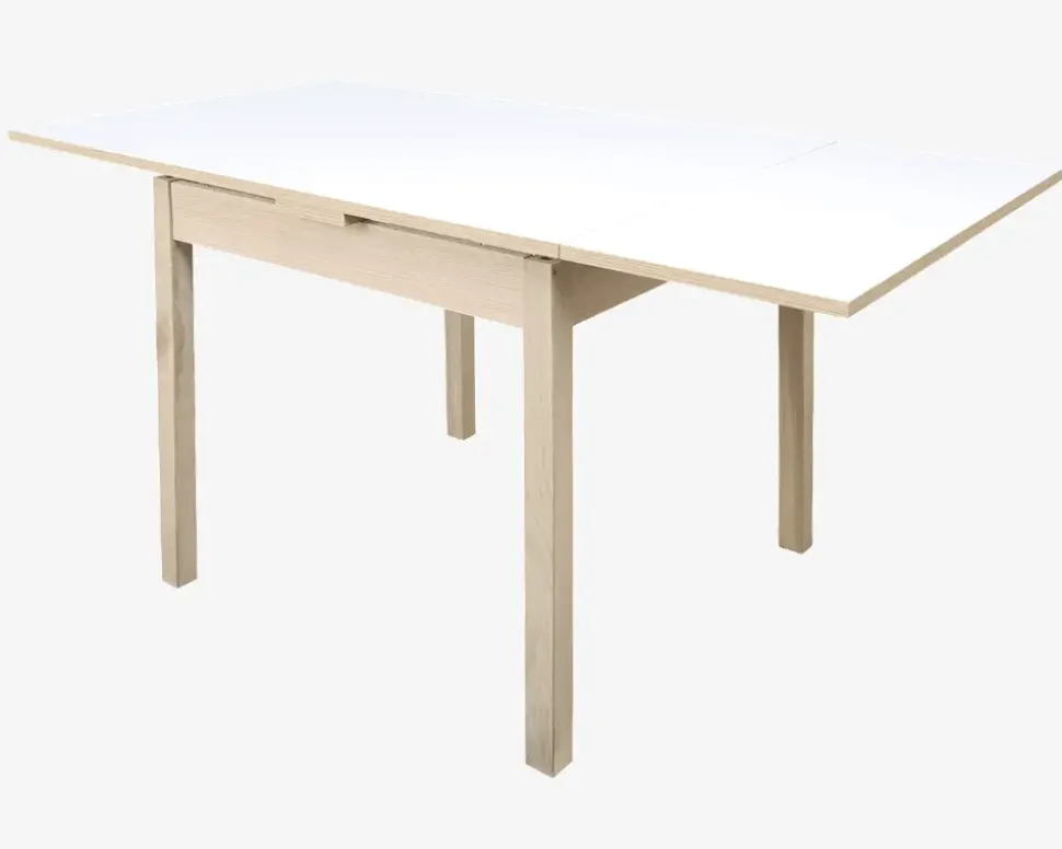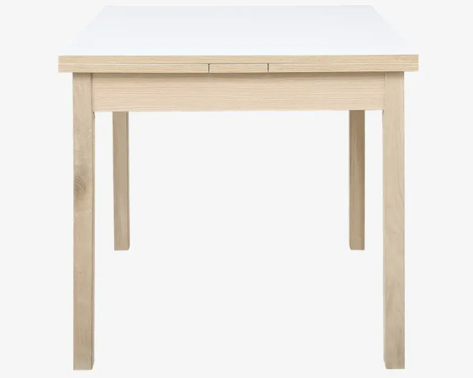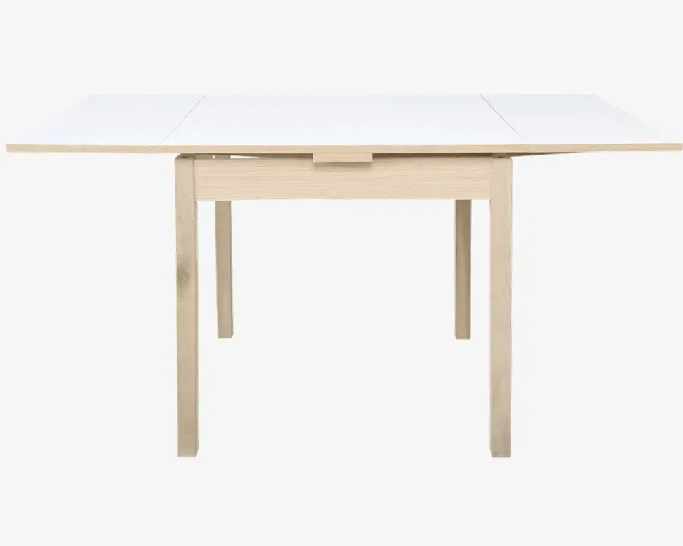 Dutch er et smart lille spisebord med hollandsk udtræk. Bordet udmærker sig ved ikke at fylde meget, og dog har du stadig muligheden for at få 6 gode spisepladser. Når bordet ikke er slået ud, måler det B.80 x L.80 cm, og er perfekt til 2 spisende personer.Bordet er velegnet til køkkenet eller den lille lejlighed, hvor I til hverdag kun har brug for 2 spisepladser, når der kommer gæster kan bordet med et snuptag udvides med en plade i begge sider, og så får du et bord der måler B.80 x L.146 cm, og dermed god plads til vennerne.Bordet er fremstillet med en bordplade i hvid kunstfiner med kanter i eg kunstfiner, og ben i massiv eg. Bordet er nemt at rengøre. Den daglige rengøring foretages med en klud vredet op i rent vand, men skulle uheldet være ude kan kraftigere rengøringsmidler sagtens bruges, de må dog ikke indeholde slibemidler. Benene monteres nemt.• Mål i cm: H.74 x B.80 x D.80• Udslået mål med 2 plader: H.76 x B.80 x L.146• Findes også i B.80 x L.120 cm• Kan også fås i sort/hvid, se varenr. 88266.• Leveres usamletKlik her for at se hvordan du bedst passer på dit nye møbelKlik her for at se hvilke plejemidler vi har
