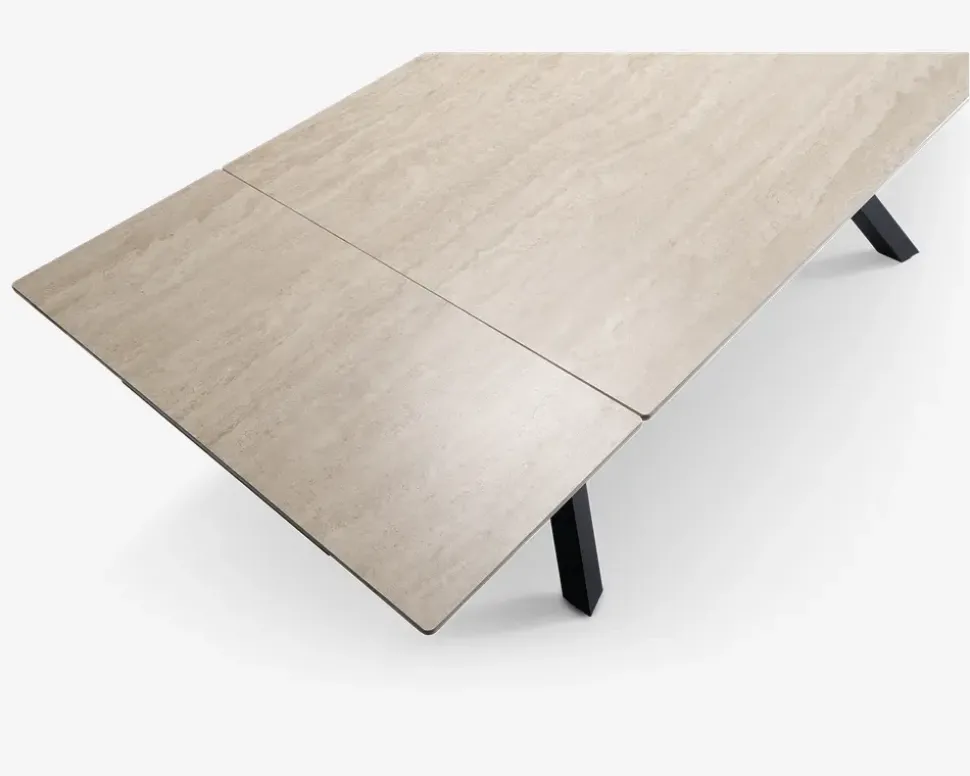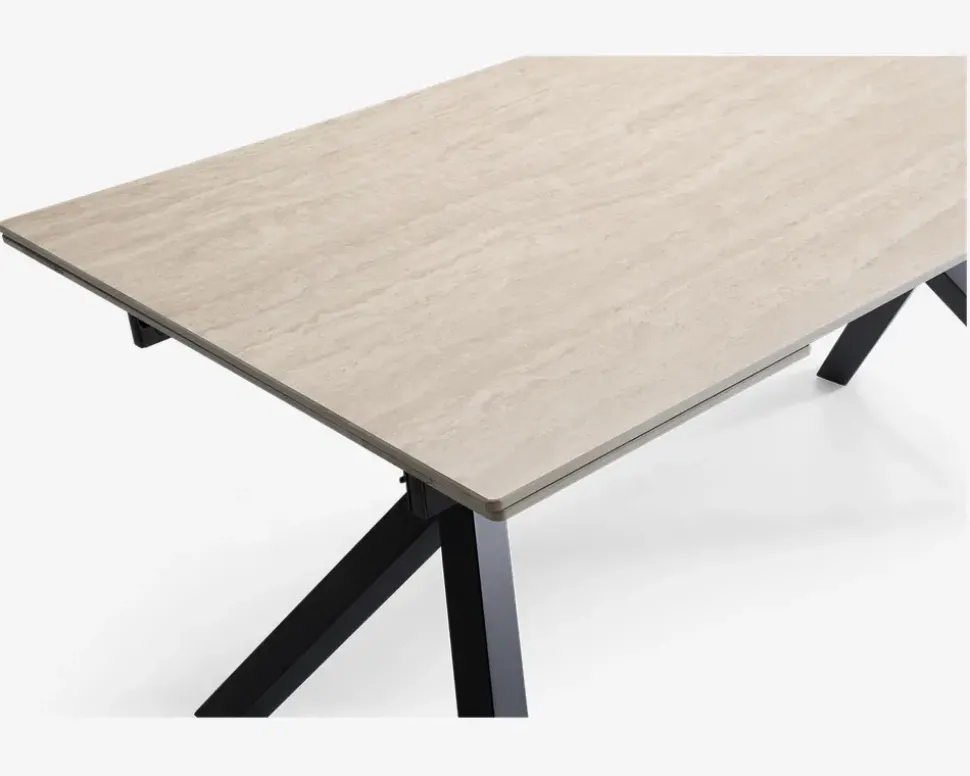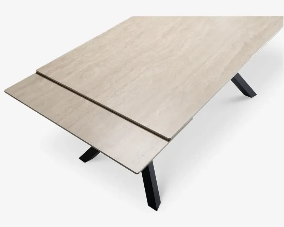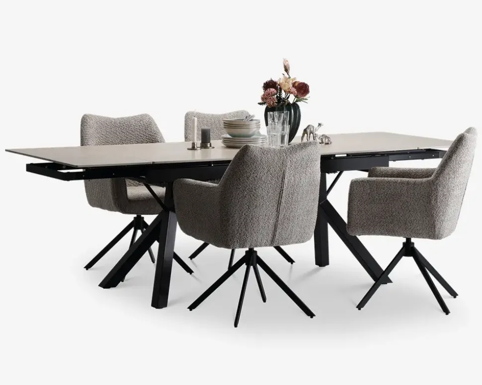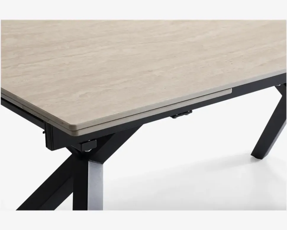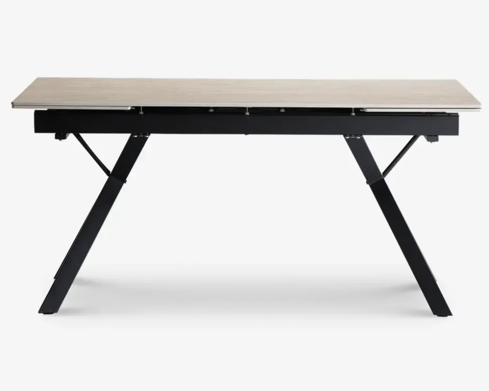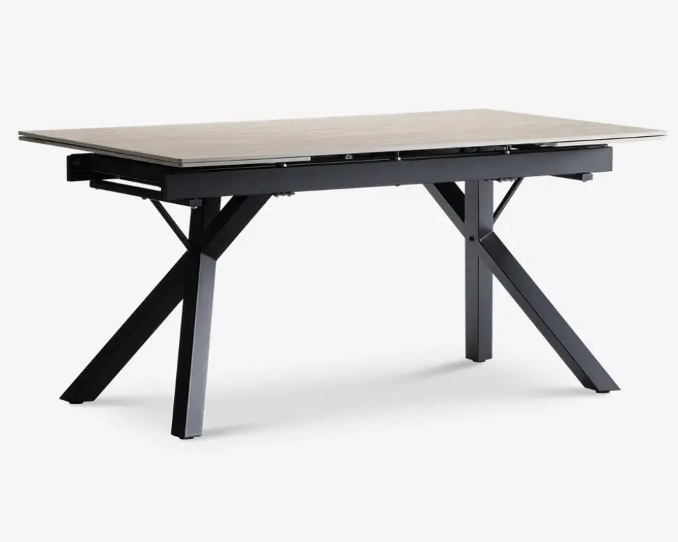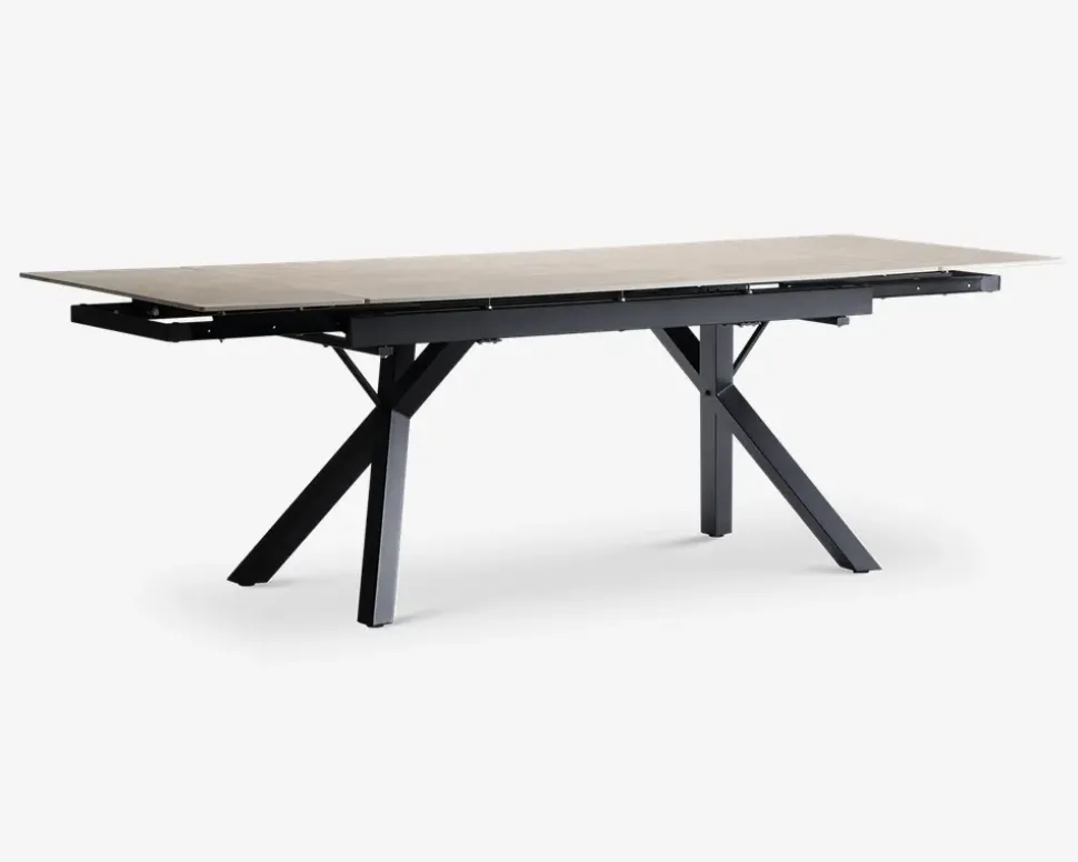 Dette flotte spisebord er fremstillet med en bordplade i glas/keramik, som giver en bordplade som både tåler varme, er ridsefast og nem at rengøre. Stellet er i sort pulverlakeret stål, og understøtte det moderne design, som vil passe rigtig godt ind i mange danske hjem. Spisebordet er udstyret med et special udtræk, som gør at begge tillægsplader trækkes ud, og skubbes ind på samme tid, det er især ideelt hvis bordet kan stå frit i rummet.Keramik/glas bordpladen giver dig en særdeles robust bordplade, som både tåler varme, og samtidig ikke ridses eller skades nemt. Den er nem at rengøre, med en klud vredet op i rent vand. Spisebordet leveres usamlet, og alene vægten på bordet gør at vi anbefaler at I er 2 når det skal samles. Skal bordet flyttes af den ene eller den anden årsag bør I ligeledes være 2. Bemærk at vægten på bordet vil trykke et eventuelt tæppe du har liggende udner flat, der hvor soklen rammer tæppet.