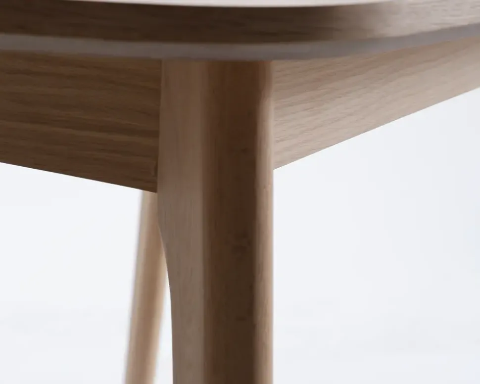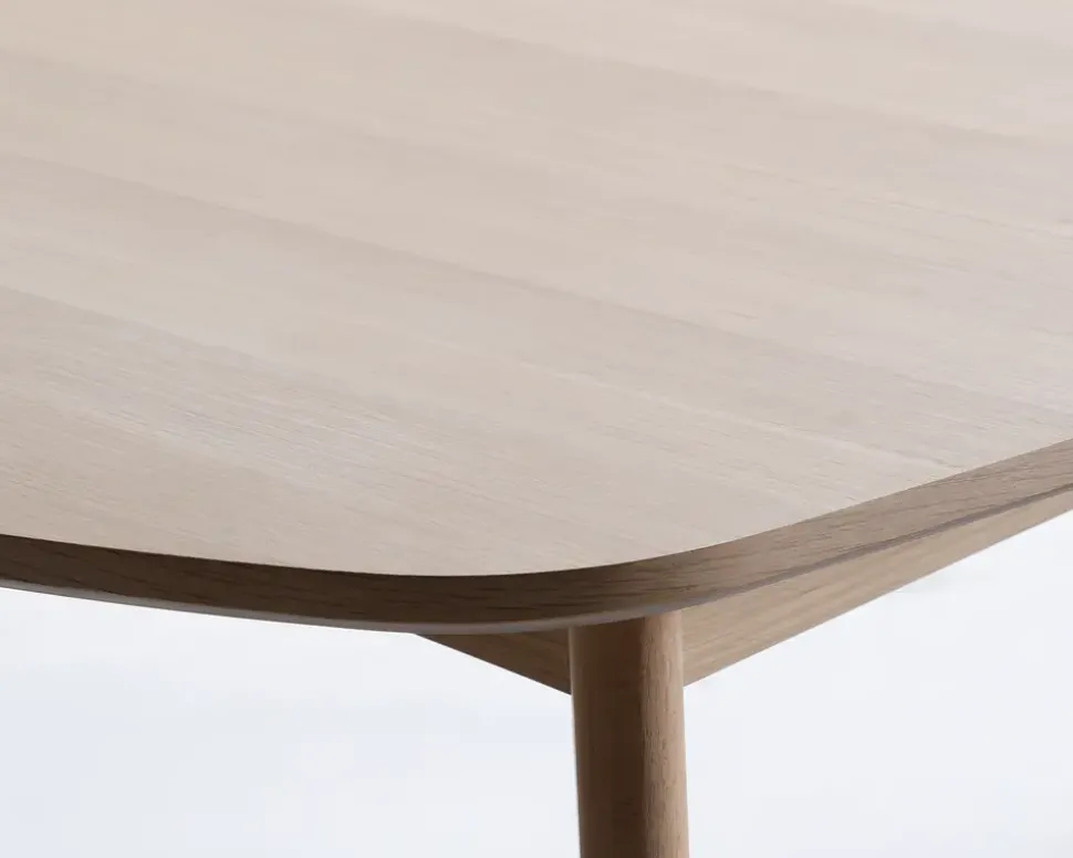 Spisebord i hvidolieret fineret eg med massive ben. Spisebordet leveres med udtræk til 2 tillægsplader, som tilkøbes separat på varenummer 35714. Spisebordet er fremstillet med en bordplade i fineret eg, som efterfølgende er hvidolieret, benene er i massiv eg, og behandlet på samme måde. Spisebordet måler B.102 x L.180 cm, og giver således 6 gode spisepladser til hverdag. Bredden på bordet sikre at der også er masser af plads til både gryder og pander. Hvis du ønsker flere pladser, kan der tilkøbes 2 ekstra tillægsplader, som forlænger bordet med 90 cm og giver yderligere 4 spisepladser. Spisebordet i fineret eg, giver en hårdfør overfalde, som dog god kan ridses, ligesom varme fra en gryde eller lignende kan afsætte mærker. Vi anbefaler derfor at du benytter dig af dug eller dækkeservietter når du dækker bordet, og varmebrikker til gryder og pander.Spisebordet kræver vedligeholdelse, 1 – 2 gange om året bør bordet rengøres grundigt, og efterbehandles med hvidolie. Dette gøres for at bevare bordpladens modstandsdygtighed i forhold til væsker, samt for at bibeholde den lyse moderne farve. Hvis du har tilkøbt løse tillægsplader bør disse sættes i bordet, og behandles samtidig, på den måde opnår du størst mulighed ensartethed mellem bordplade og tillægsplader. Du skal altid følge vejledningen på den olie du vælger at bruge. Bordet leveres usamlet, men det er kun de 4 ben der skal monteres, så det klares let. Vi anbefaler at I er 2 når bordet skal vendes eller flyttes.
