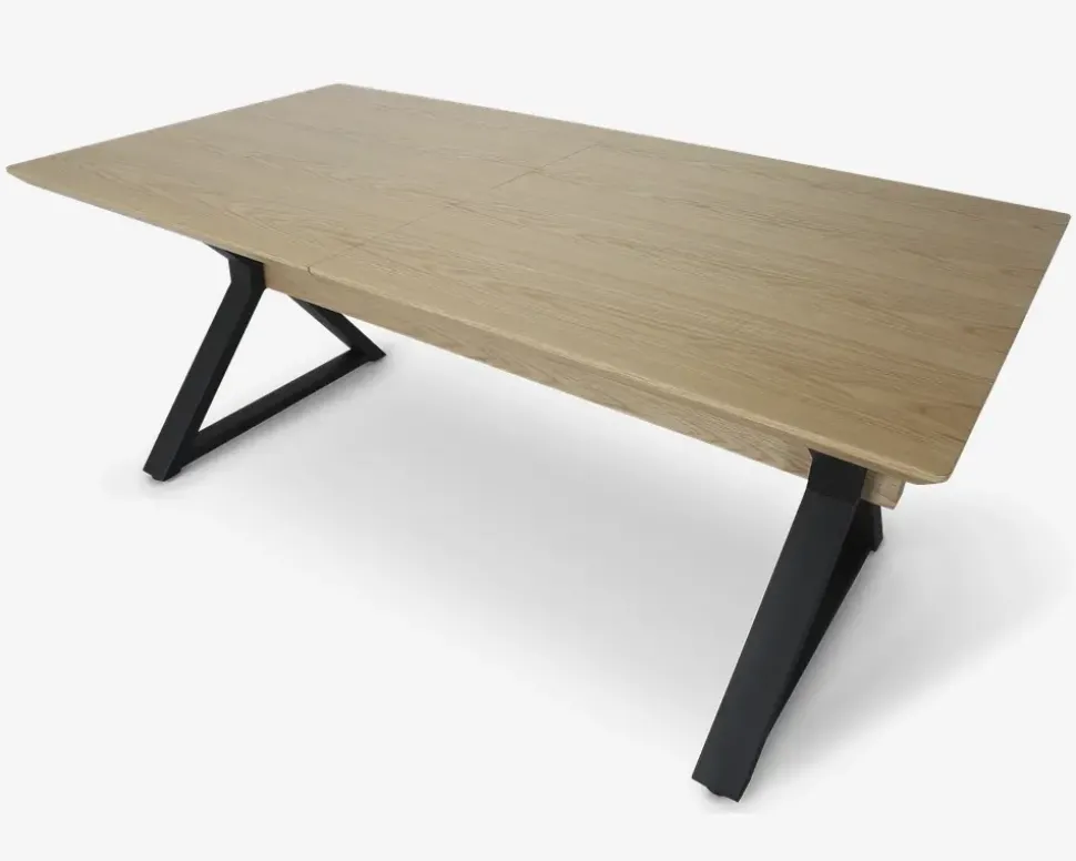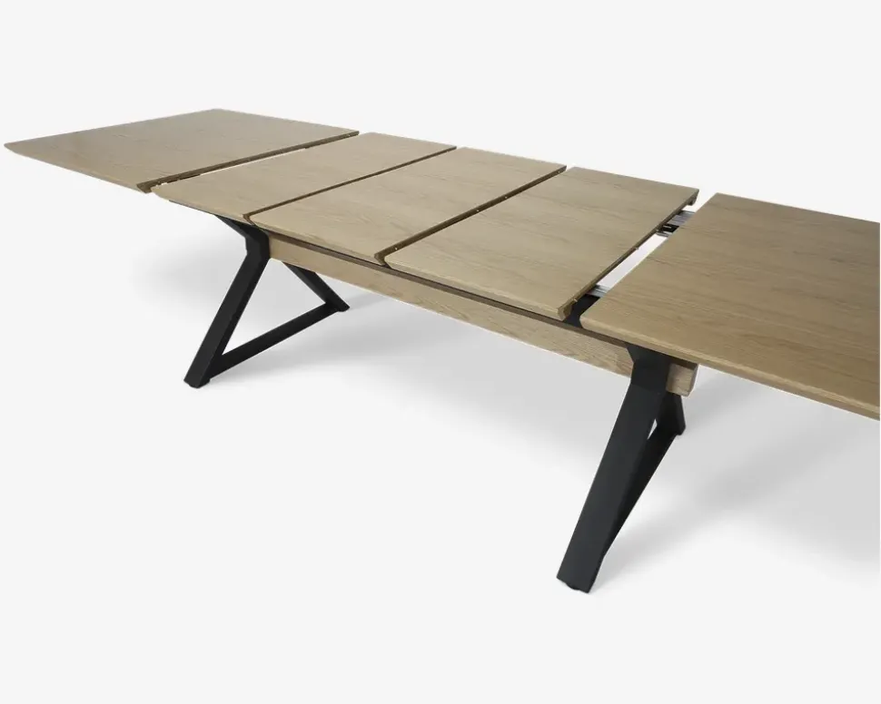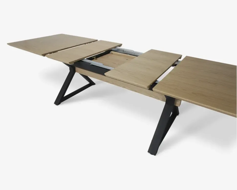 Her har du et spisebord som kan vokse sammen med antallet af gæster. Spisebordet måler B. 100 x L. 180 cm, men med 3 butterfly tillægsplader som alle opbevares i spisebordet, kan bordet bliver 300 cm langt, og dermed masser af plads til den store familie, eller masser af gæster. Spisebordet giver plads til 10 – 12 personer fuldt udslået. Spisebordet er fremstillet med en bordplade i fineret hvidpigmenteret eg, som efterfælgende er lakeret, og et sort stålstel som giver en robust base til det store spisebord.Spisebordet kræver ingen vedligeholdelse, og rengøres med en klud vredet op i rent vand. Der må ikke benyttes rengøringsmidler med slibende effekt, da disse vil ødelægge lakken. Der må ikke lægge væsker på bordpladen i en længere periode, da disse vil lave mærker i træet. Vi anbefaler altid at du benytter dækkeservietter eller dug, samt varmebrikker når du serverer meden, det vil skåne bordpladen, og give dig et bord som står flot i mange år.Spisebordet er på grund af konstruktionen tungt, og du kan med fordel monterer kraftige filtdupper på bordbenene når du samler bordet, disse kan tilkøbes. Vi anbefaler at i er to når bordet skal samles og placeres, for at undgå skader på både spisebordet og hjemmet. I bør også hjælpes når bordet skal udvides, da det trækkes ud i begge ender.• Udslået mål med 1, 2 og 3 tillægsplader: 100 x 180/220/260/280 cm.
