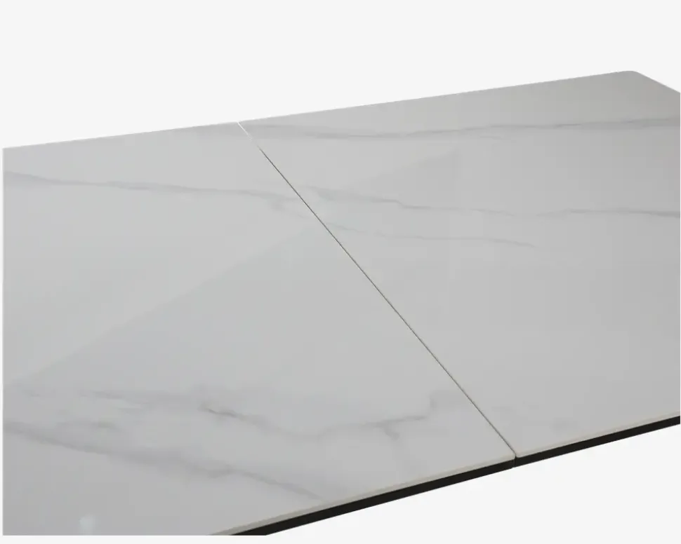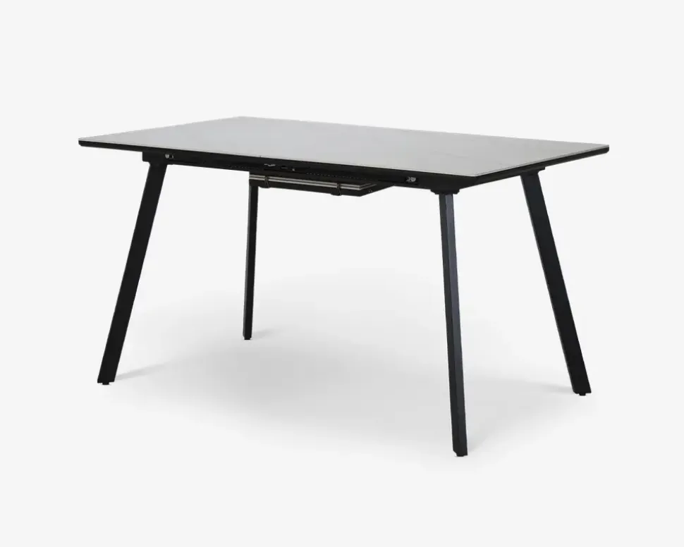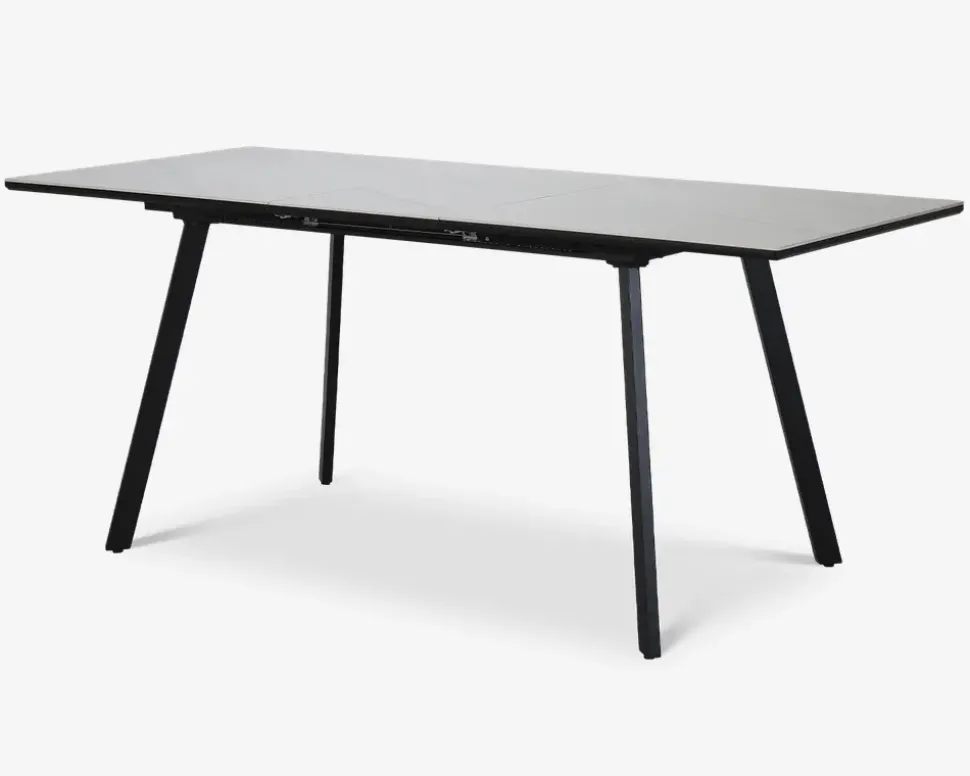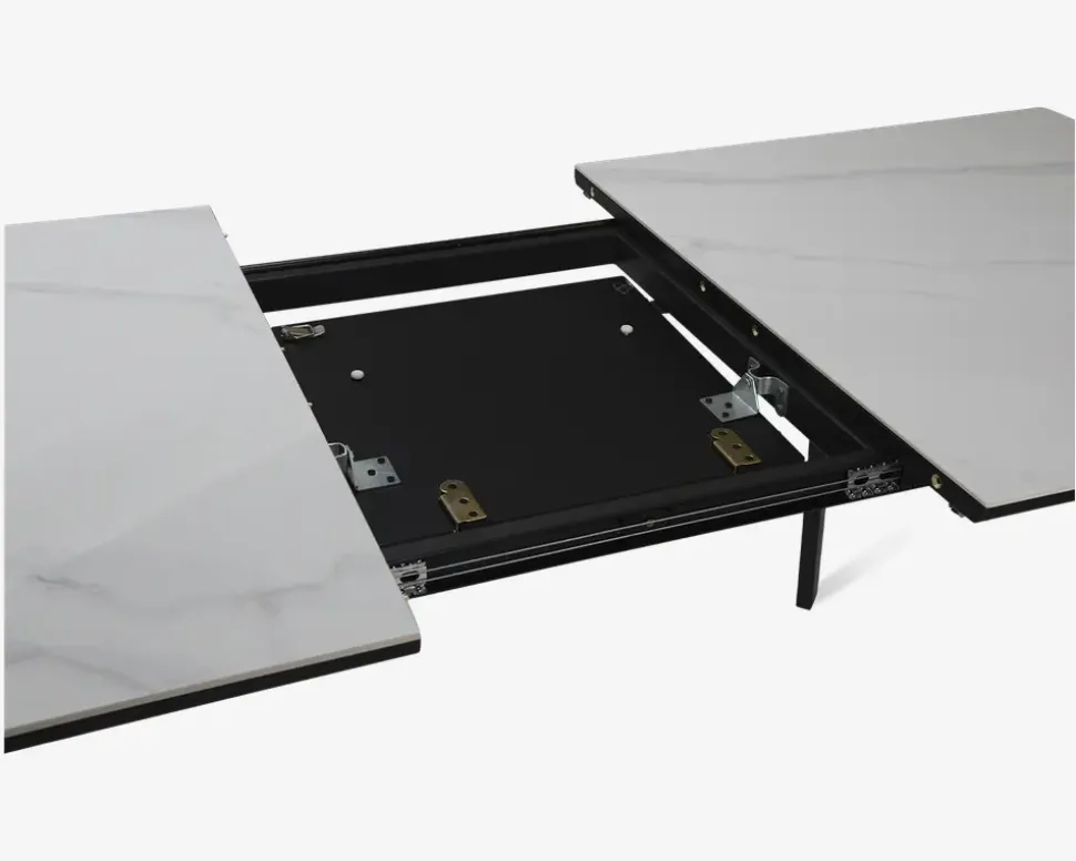Her har du et robust og smukt spisebord fremstillet i sintret sten. Sintret sten er et kunstig fremstillet produkt af naturmaterialer som er presset sammen og brændt ved meget høj varme. Det giver en mere ensartet overflade end ægte marmor, og derudover for du en overflade som både er hårdere, mere ridse og slagfast.Dette spisebord er fremstillet med en bordplade i hvid, og ben i sortlakeret stål. Bordet måler B. 80 x L. 140 cm. I bordet lægger en butterfly tillægsplade, som betyder at bordet kan udvides til 180 cm når det er udtrukket, og du får så 6 gode spisepladser, 8 hvis du bruger bordenden.Bordet kræver ingen vedligeholdelse, rengøringen foretages med en klud vredet op i rent vand.Spisebordet leveres usamlet, og vi anbefaler på grund af vægten at I er 2 når bordet skal samles eller flyttes. Brug filtdupper på fødderne, så ikke du får ridset gulvet.