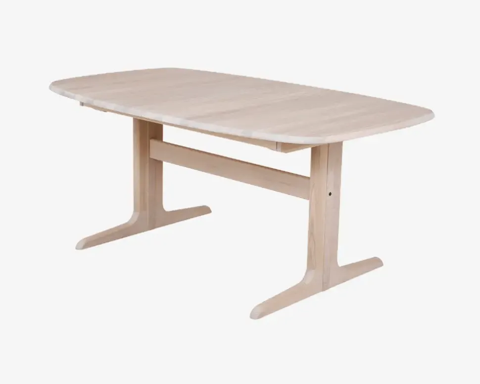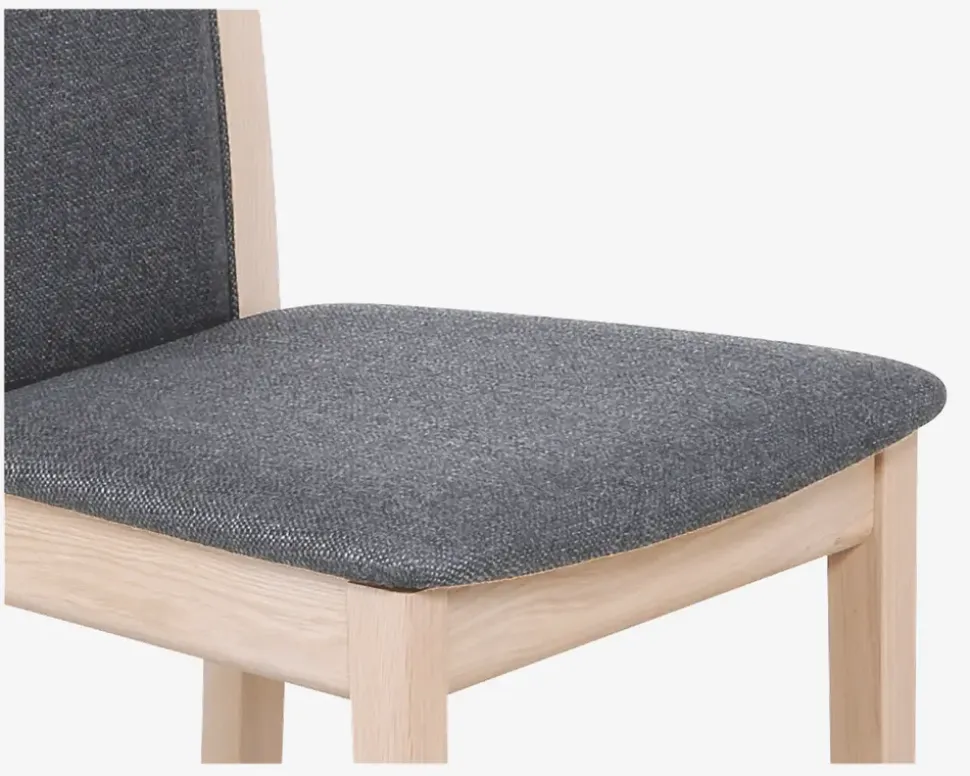 Her tilbyder vi dig et sæt bestående af et spisebord i massiv hvidolieret eg, med 2 tillægsplader i fineret hvidolieret eg, samt 4 spisestuestole i slidstærkt møbelstof. Spisebordet måler B.100 x L.165 cm men kan udvides til en længde på 265 cm, med de to medfølgende tillægsplader, som når de ikke er i brug kan opbevares i et magasin i bordet, så du altid har dem inden for rækkevidde.Bordet er fremstillet i massiv hvidolieret eg, mens de to tillægsplader er i fineret hvidolieret eg, bordet har synkronudtræk, hvilket gør det til en leg at trække bordet ud og ligge tillægspladerne i. Stolene giver med sin halvhøje ryg, og faste polstring en behagelig og støttende siddekomfort, som du vil glæde dig over, når middagen trækker ud i selskab med familie og venner. Møblerne er fremstillet hos den danske møbelproducent Skovby Møbelfabrik. Skovby Møbelfabrik har produceret kvalitetsmøbler til spisestuen siden 1933, og udmærker sig ved at alle deres møbler er fremstillet efter gamle håndværksmæssige værdier. Materialerne der bliver brugt hos leverandøren er special udvalgte, og sammen med en passion og en dygtig medarbejderstab fremstiller de spisestuemøbler som bliver solgt i hele verden. Her får du møbler som du vil have glæde af i mange år frem over.• Sædepolstring: 100% Polyester• Mål på bord i cm.: H.73 x B.100 x L.165 • Udslået mål i cm.: B.100 x L.265• Mål på stol i cm: H.95 x B.47 x D.56, • Sædehøjde 46 cm• Bord leveres usamlet, stole leveres samlet.