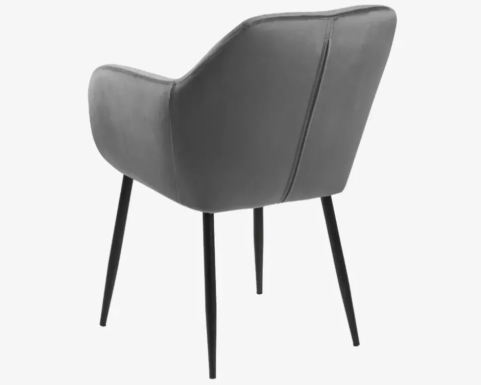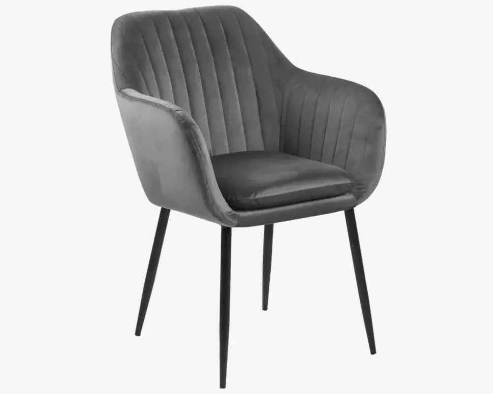 Spisestuestol med armlæn. Denne spisestuestol er fremstillet i velour, og findes i 3 forskellige farver, alle stolene har sort metalstel. Spisebordsstolen er en rigtig flyder, den giver en god siddekomfort, som understøttes af den kraftige polstring ryggen, og den lille ekstra stolehynde på sædet, som er med til at sikre at du kan sidde i stolen, selv om middagen bliver lang og hyggelig. Stolen kan kombineres med spiseborde i mange forskellige stilarter, men er særdeles velegnet sammen med plankeborde som med sit rustikke udseende vil stå flot sammen med denne elegante spisestol. Om du vælger stolen i blå, grøn eller grå, er helt op til dig og hvor meget farve du ønsker i hjemmet.Armstolen kræver ingen vedligeholdelse, den daglige rengøring foretages med en klud vredet op i rent vand, samt eventuelt en støvsuger. Stolen sælges stykvis, og leveres usamlet.