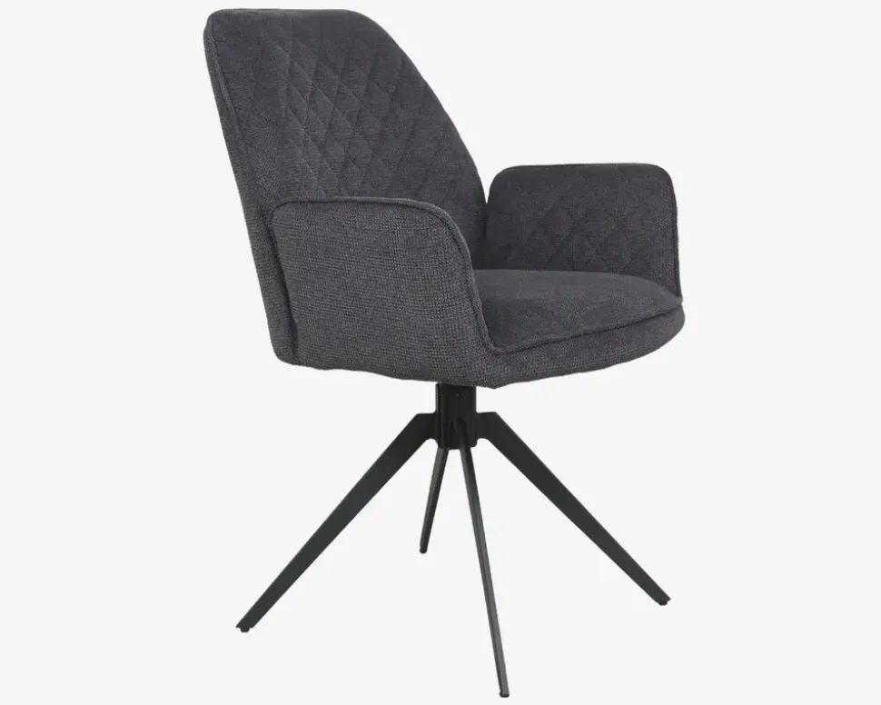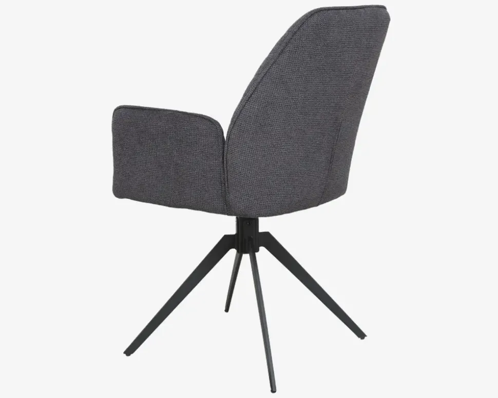 Flot designet spisebordsstol med armlæn og drejefod. Stolen tilbyder en god siddekomfort, både fordi ryggen er høj, sædet er bredt, og armlænene en tilpas højde til at understøtte en god siddekomfort, som vil glæde dig dag efter dag. også når aftenen bliver hyggelig og trækker ud. Det er takket været drejet i soklen også nemt både at sætte sig i stolen, og komme op hvis man trænger til en pause under middagen. Stolen er fremstillet med slidstærkt stof i polyester, og drejestel i sort pulverlakeret stål. Spisebordsstolen kræver ingen vedligeholdelse, og holdes ren med en klud vredet op i rent vand. Stolen sælges i 2 stk´s og leveres samlet. Klar til brug når du har taget dem ud af kassen.Vær opmærksom når du rejser dig fra stolen, med swingback funktionen drejer sædet tilbage til udgangs postionen, og du risikerer at sædet ikke befinder sig der hvor du regner med, når du skal ned og sidde.