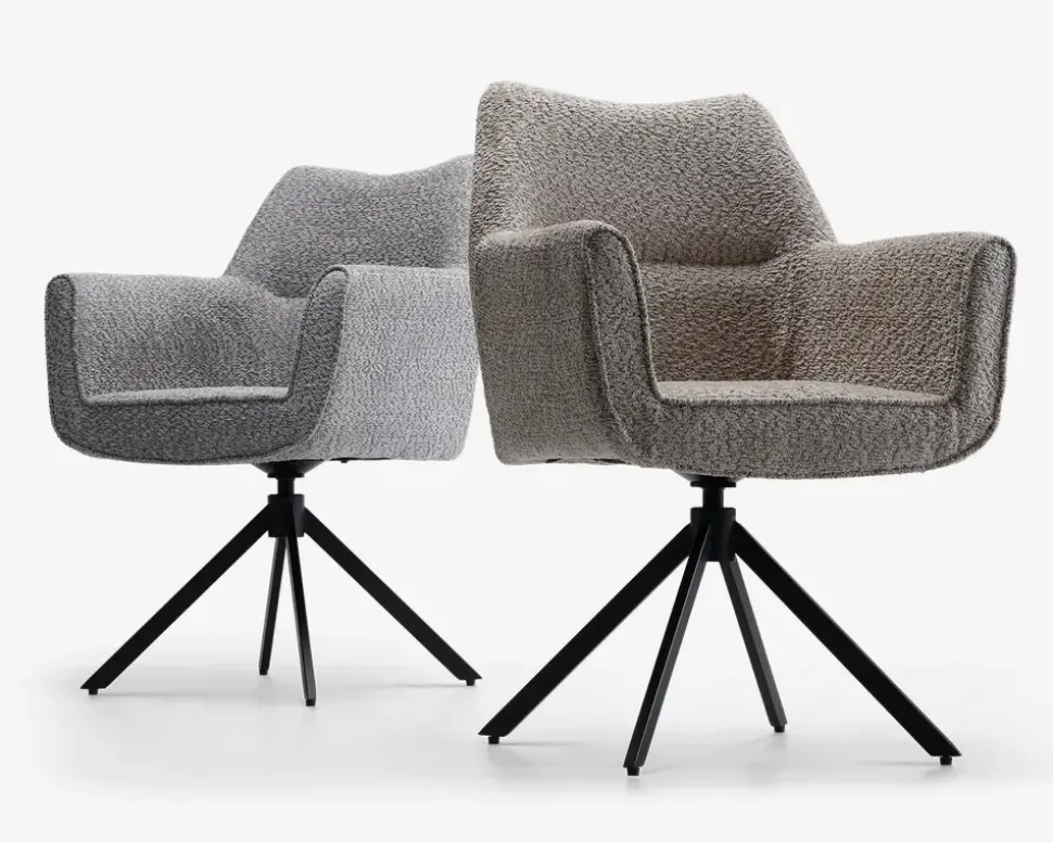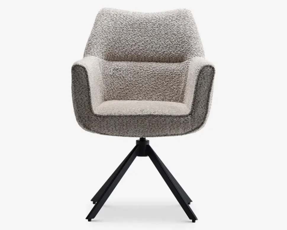Flot designet spisebordsstol med armlæn, som er fremstillet i et flot moderne betræk, med sorte stålben. Stolen har 360° rotation, som gør det nemt at komme op fra stolen, det er dog vigtigt at du er opmærksom på det hvis du holder en tale og vil sætte dig ned igen. Stolen findes i 2 forskellige farver betræk beige og grå, så den vil passe ind i den moderne indretning. Stolen er bedst sammen med et spisebord der har en hvis størrelse, da armlænene gør stolen bred.Spisestuestolen kræver ingen vedligeholdelse, og rengøringen foretages med en klud vredet op i rent vand. Den sælges i pakker af 2 stk., og er nemt at samle det er kun stellet der skal monteres.