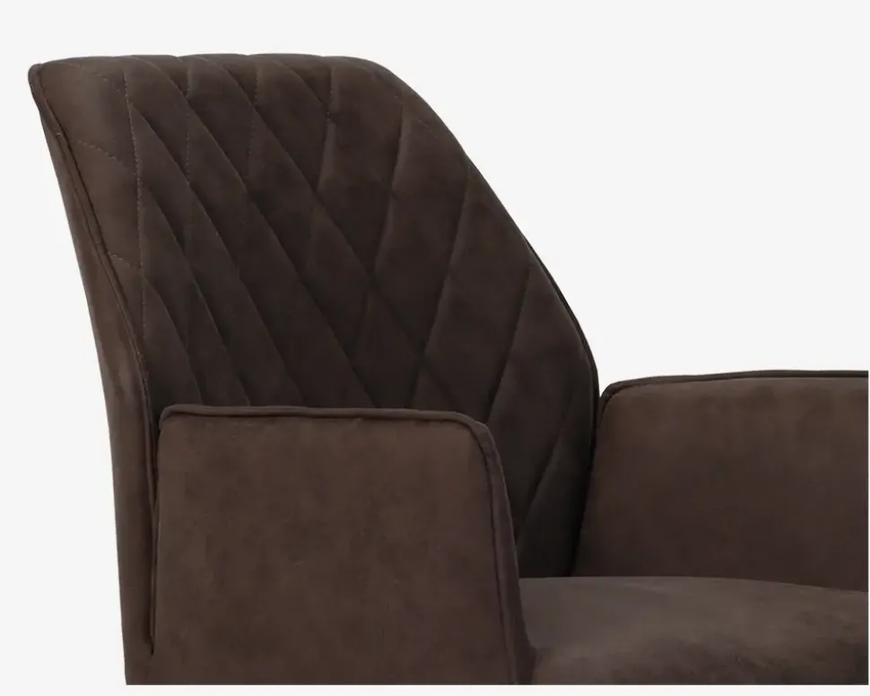 Spisestuestol med armlæn, og en fremragende siddekomfort. Stolen passer i designet flot sammen med Plankeborde, eller andre lidt større spiseborde. Spisestuestolen har en virkelig god siddekomfort, og armlænene er med til at understøtte den gode siddekomfort, og stolen er perfekt til de lange middage eller spilleaftener i familien.Spisebordsstolen er fremstillet i en brunt mikrofiber, med et lidt antikt udseende, hvilket er perfekt hvis dit spisebord er et plankebord. Stellet er i sortlakeret stål, og du kan med fordel monterer filtdupper under stolenes ben, da stolen i sagens natur er tung, mens designet stadig er elegant.Stolen kræver ingen vedligeholdelse, og er nem at holde ren, alt du behøver er en klud vredet op i rent vand. Pas på benene når du støvsuger, så du undgår at ridse dem. Stolen sælges i pakker af 2 stk.• Højde til armlæn overkant er 64,5 cm.