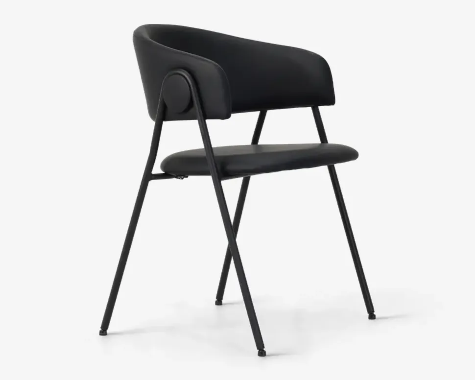 Leder du efter en spisebordsstol i høj kvalitet med en fremragende siddekomfort og et moderne design, er dette måske stolen du leder efter. Spisestuestolen passer både sammen med et meget moderne spisebord, og et klassisk langbord i eg, uanset hvilket du vælger vil stolen fremstå flot sammen med. Stolen har en god bredde, og ryglænet sidder det rigtige sted i forhold til lænden, så det er en spisestuestol som man uden problemer kan sidde i, hele aftenen.Spisestolen er fremstillet med søde og ryg i sort kunstlæder, mens stellet er fremstillet i sort pulverlakeret stål. Spisestuestolen kræver ingen vedligeholdelse, og aftørres med en klud vredet op i rent vand. Stolen sælges i pakker af 2 stk. og leveres samlet.
