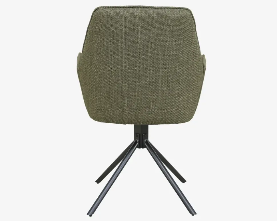 Her har du en flot spisestuestol med armlæn og en fremragende siddekomfort. Stolene er fremstillet i kraftig grønt møbelstof, mens basen er i sort stål. Basen er en dreje base, som gøre stolen utrolig let at sætte sig i, og rejse sig fra selv om I sidder mange ved bordet. Basen har en “swing back” funktion, som betyder at stolen drejer tilbage til udgangspunktet når man slipper den, dette skal man naturligvis være opmærksom på, så man kan undgå eventuelle faldskader, fordi sædet ikke er der hvor man regner med.Stolen kræver ingen vedligeholdelse, og rengøres med en klud vredet om i rent vand. Du bør være opmærksom når du støvsuger, så du undgår at ridse stellet. Spisestuestolen findes også uden armlæn, så du har mulighed for at kombinerer rundt om bordet.