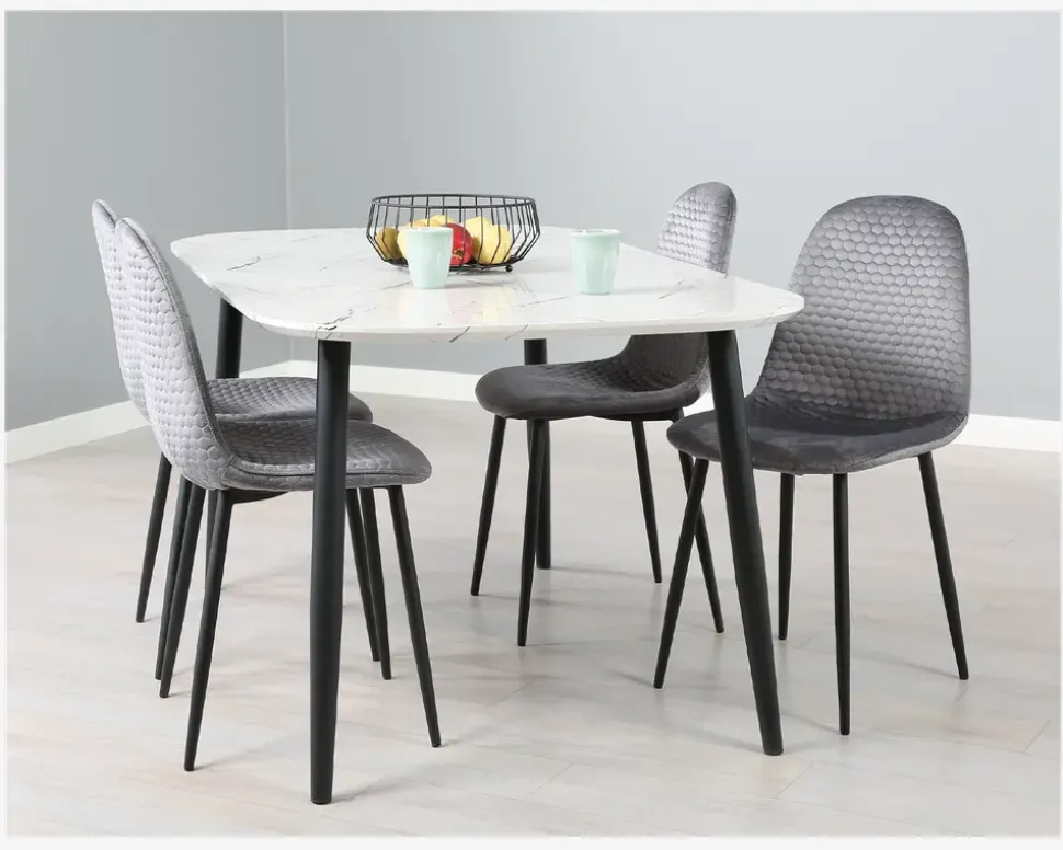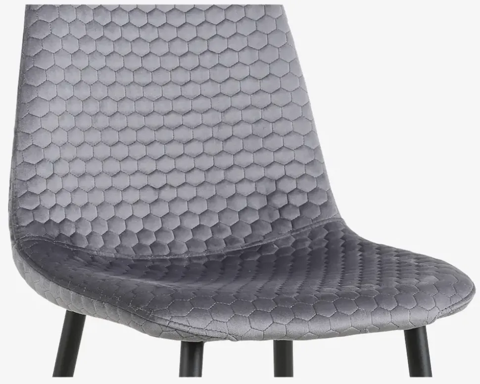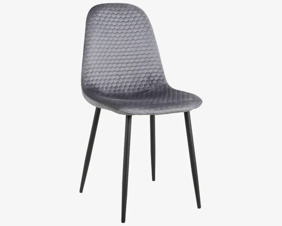 En lækker spisebordsstol med en god siddekomfort, som kan kombineres med en lang række forskellige spiseborde. Stoffet er grå velour, og syninger i ryggen giver stolen et flot udseende, benene er i sort pulverlakeret stål. Den gode sædeform og polstring giver stolen en behagelig og støttende siddekomfort som du vil glæde dig over. Stolen sælges i pakker af 4 stk.Stolen kræver ingen vedligeholdelse, og den rengøres med en klud vredet op i rent vand, husk at tørre efter med en tør klud. Benene er i pulverlakeret stål eller 3-D laminering, det betyder at de kan ridses og skrammes, så vær forsigtig når du støvsuger, så vil stolene holde sig flot i mange år. Stolene levers usamlet, men de 4 ben monteres let.