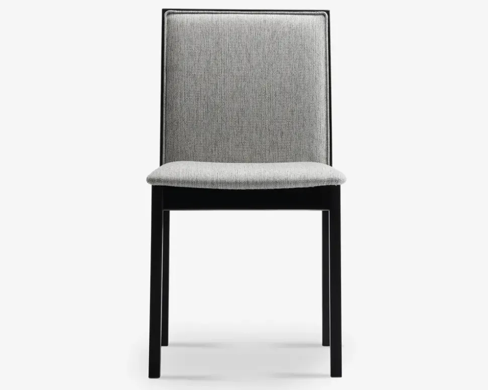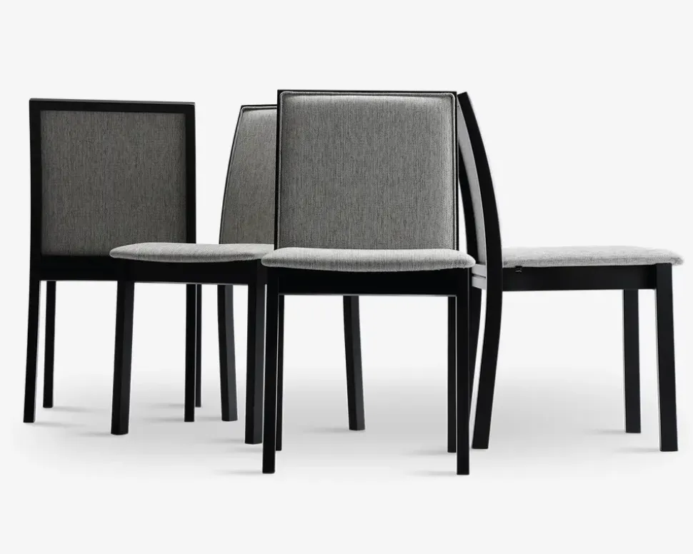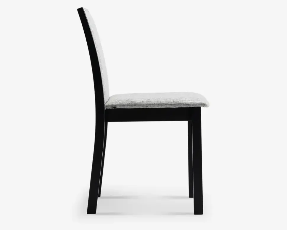 Denne moderne spisebordsstol fra den danske producent Skovby Møbelfabrik, tilbyder en god siddekomfort. Designet er minimalistisk og moderne, og stolene passer lige godt, om du har et klassisk spisebod, eller har bevæget dig ud i et af de meget moderne plankeborde i eg. Skovby er kendt for at fremstille en høj kvalitet, og ikke at gå på kompromis med kvaliteten af materialerne, det gælder også for denne spisestol som er fremstillet i massiv eg som er sort lakeret, og det lyse grå betræk er slidstærkt, og passer fint ind i mange spisestuer.Vi har været heldig at købe et parti af denne stol, og de sælges efter først til mølle princippet.Spisestuestolen kræver ingen vedligeholdelse, og rengøringen foretages med en klud vredet op i rent vand. Stolene leveres samlet.