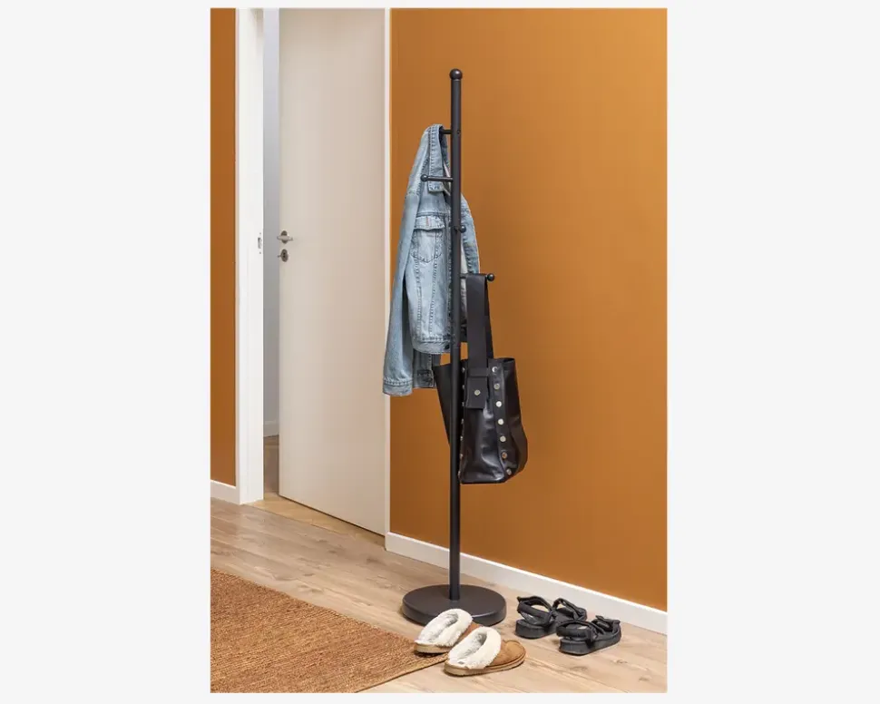 Smart stumtjener som ikke fylder alverden i entreen, men stadig giver dig 5 knager og toppen til at hænge dit overtøj på. Der er både plads til børnejakken, sommer jakken og den lange frakke. Den tungefod giver stumtjeneren en god stabilitet, dog kan det skabe problemer, hvis du hænger for mange våde jakke på den samme side.Stumtjeneren er fremstillet i pulverlakeret stål, og den elevres usamlet, der medfølger monteringsvejledning, så det skulle ikke skabe de store problemer.Stumtjeneren kræver ingen vedligeholdelse, og aftørres med en fugtig klud efter behov. Bemærk den lakerede overflade kan ridses.