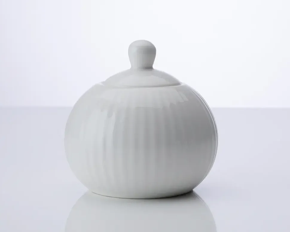 Denne stilrene sukkerskål er fremstillet i porcelæn, som sikrer en smuk glans, holdbarhed og et let design. Den er ideel til servering og passer perfekt ind i enhver borddækning.