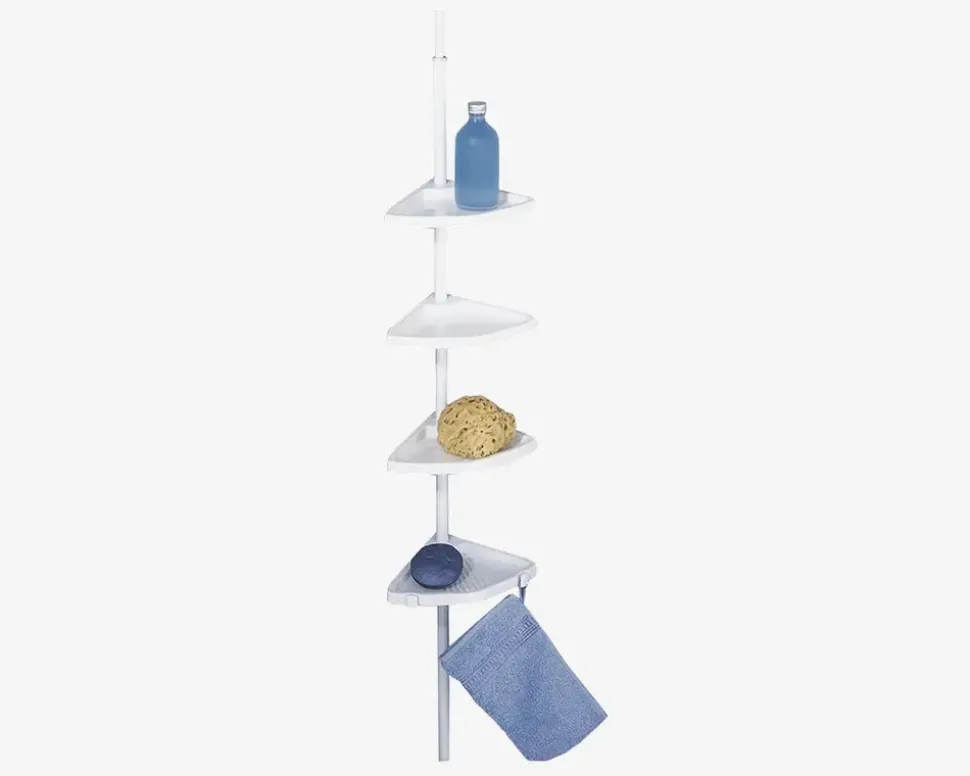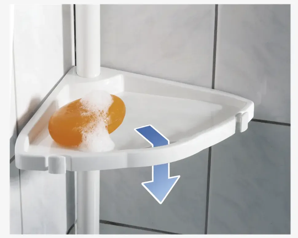 Hvis du mangler opbevaringsplads i bruseren er denne hjørnehylde perfekt til din bruser. Teleskopstang med 4 stk. opbevaringshylder til brusekabine som kan bruges til opbevarings af badesvampe, shampoo m.m. Teleskopstangen er fremstillet i aluminium og hylderne er i hvid plast. Den nederste hylde er udstyret med 2 kroge, der giver ekstra opbevaring.