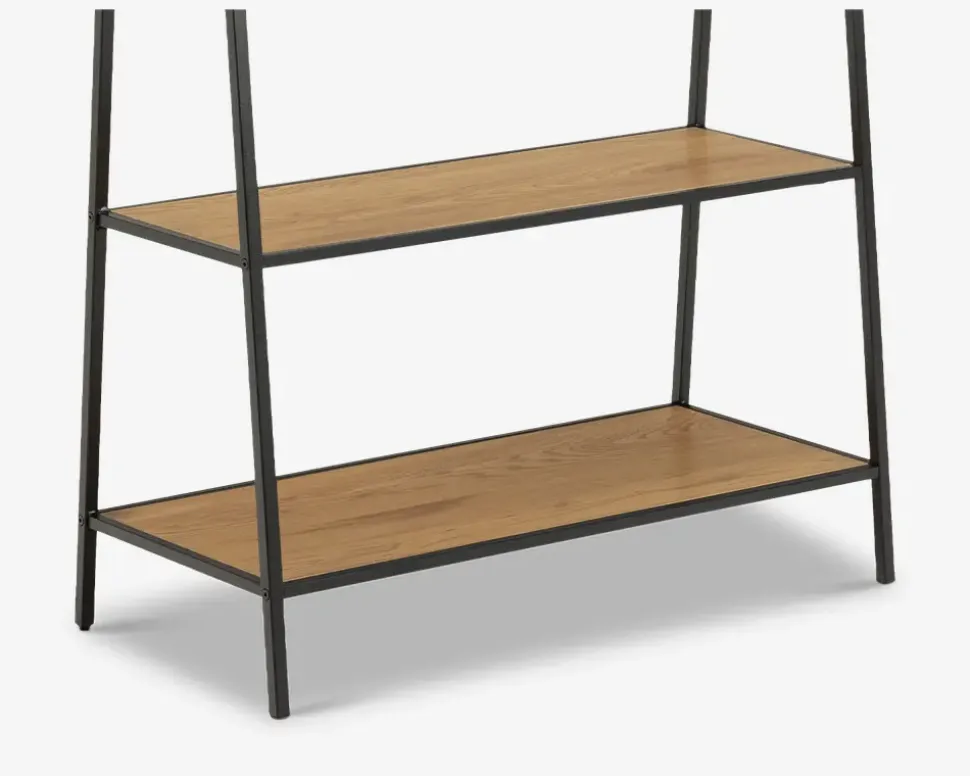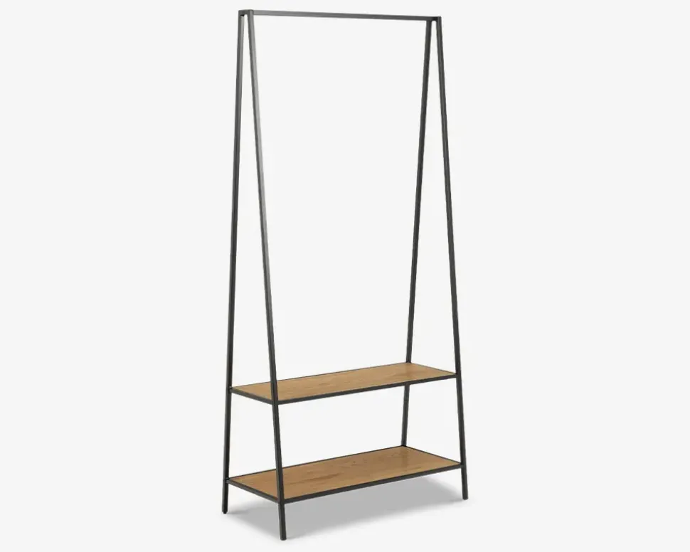 Seaford tøjstativet er både praktisk og dekorativt, uanset om du benytter det i entreen, soveværelset eller på børneværelset. Garderobestativet giver både plads til bøjletøj, og de to praktiske hylder kan både bruges til sko, eller bluser som skal foldes. Stativet er fremstillet med et sort pulverlakeret stel, og hylder i vild eg kunstfiner. Rengøringen foretages med en klud vredet op i rent vand. Stativet leveres usamlet, men samles nemt hvis I følger den vedlagte samlevejledning.