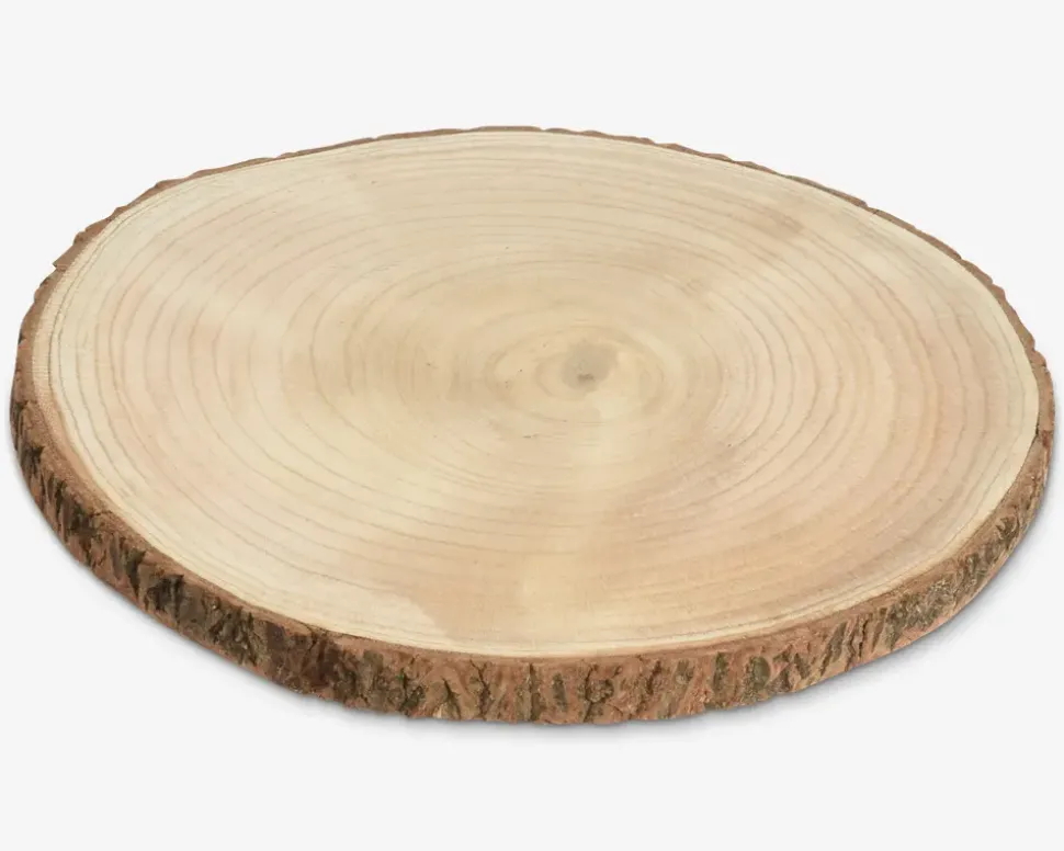 Dekorativ træskive med bark, der måler Ø.30 x H.2 cm. Skiven er velegnet til juledekorationer, lys, planter eller som en naturlig detalje på borddækningen. Forventet hjemme i uge 45.