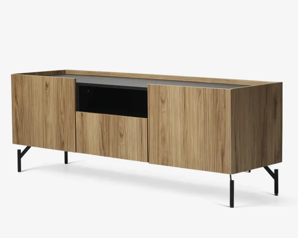 Smart og moderne designet tv-bord med mange flotte detaljer. Tv-bordet har en skuffe og 2 skabe, hvilket giver rigtig meget opbevaringsplads. Ydermere har tv-bordet en stor hylde. Tv-bordet er fremstillet i kunstfiner som er meget rengøringsvenligt. Tør blot af med en hårdt opvredet klud. Mere behøver man ikke. Ingen ekstra vedligeholdelse er nødvendig. Tv-bordet har også flot designede sorte metalben. Tv-bordet leveres usamlet, men samles nemt. • Smart og moderne tv-bord• Stor skuffe og stort skab• Meget rengøringsvenligt.• Leveres usamlet, men samles nemt• Mål i cm. L.147 x H.54 x D.41,3
