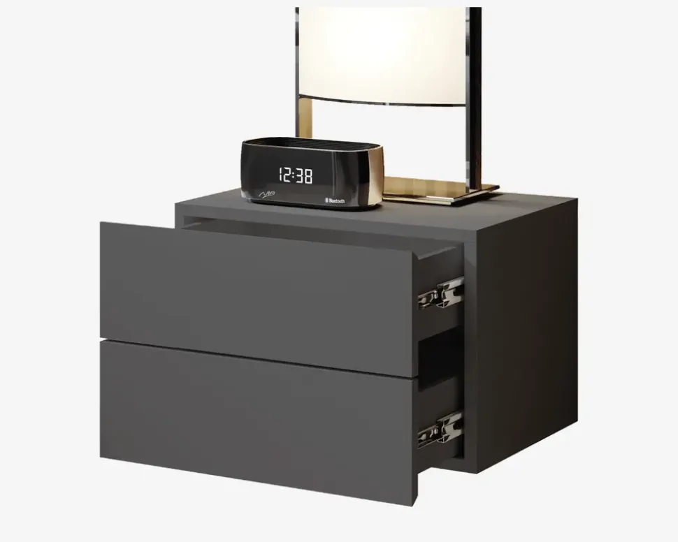 Moderne væghængt sengebord med 2 skuffer. Et vægtsengebord letter både rengøringen, og giver en let indretning af soveværelset, uden at du går på kompromis med opbevaringspladsen til bøger, brille eller lignende som er rare at havde inden for rækkevidde når du er gået i seng.Sengebordet er fremstillet i grafitgrå kunstfiner, og de 2 skuffer kører nemt i metaludtrækket, som også sikre at skufferne ikke kan trækkes for langt ud.Sengebordet kræver ingen vedligeholdelse, rengøringen foretages med en klud vredet op i rent vand.• 2 skuffer• Metaludtræk• Stop • Mål i cm. H. x B. x D.: 28 x 42 x 30• Leveres usamlet