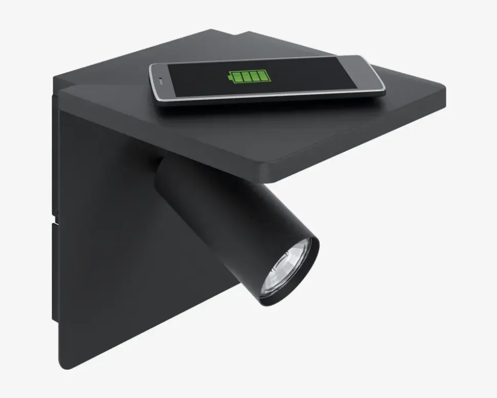 Væglampen Ciglie fra Eglo er en innovativ og praktisk lampe med et moderne design i sort farve. Denne væglampe er udstyret med en trådløs oplader, der gør det nemt og bekvemt at oplade dine elektroniske enheder. Ciglie væglampen er ideel til soveværelset, kontoret eller andre områder, hvor du har brug for både belysning og muligheden for at oplade dine enheder. Den giver et behageligt lys og tilføjer samtidig en praktisk funktion til dit rum. Der er en tænd/sluk knap under lampen, for nemt at styre om du ønsker lys eller ej. • Mål i cm: H.18 x B.18 x D.21• Farve: Sort• Materiale: Aluminium, stål• Fatning: GU10 4,5W inkl. (Kan udskiftes)• Lumen: 345• Kelvin: 3000• Levetid i timer: 15.000• Energiklasse: F• Ledningslængde: 200cm, sort